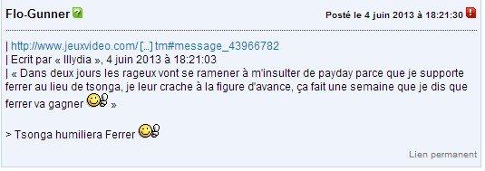 "Vous, vous supportez pour la plupart Tsonga pour la seule raison qu'il a battu un Federer dans un jour sans, en milieu de semaine, soit depuis 2 jours. Awesome."