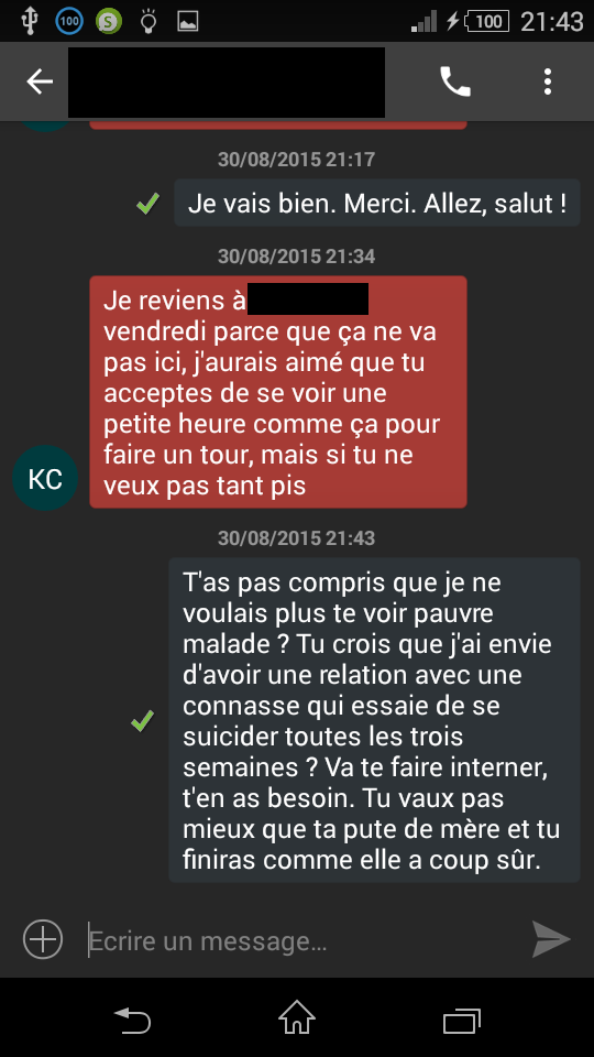 Non mais quand tu vois ce qu'elle poste sur fb, moi j'ai qu'une envie c'est de parler avec elle pour l'aider. Pour pas qu'elle fasse de connerie.