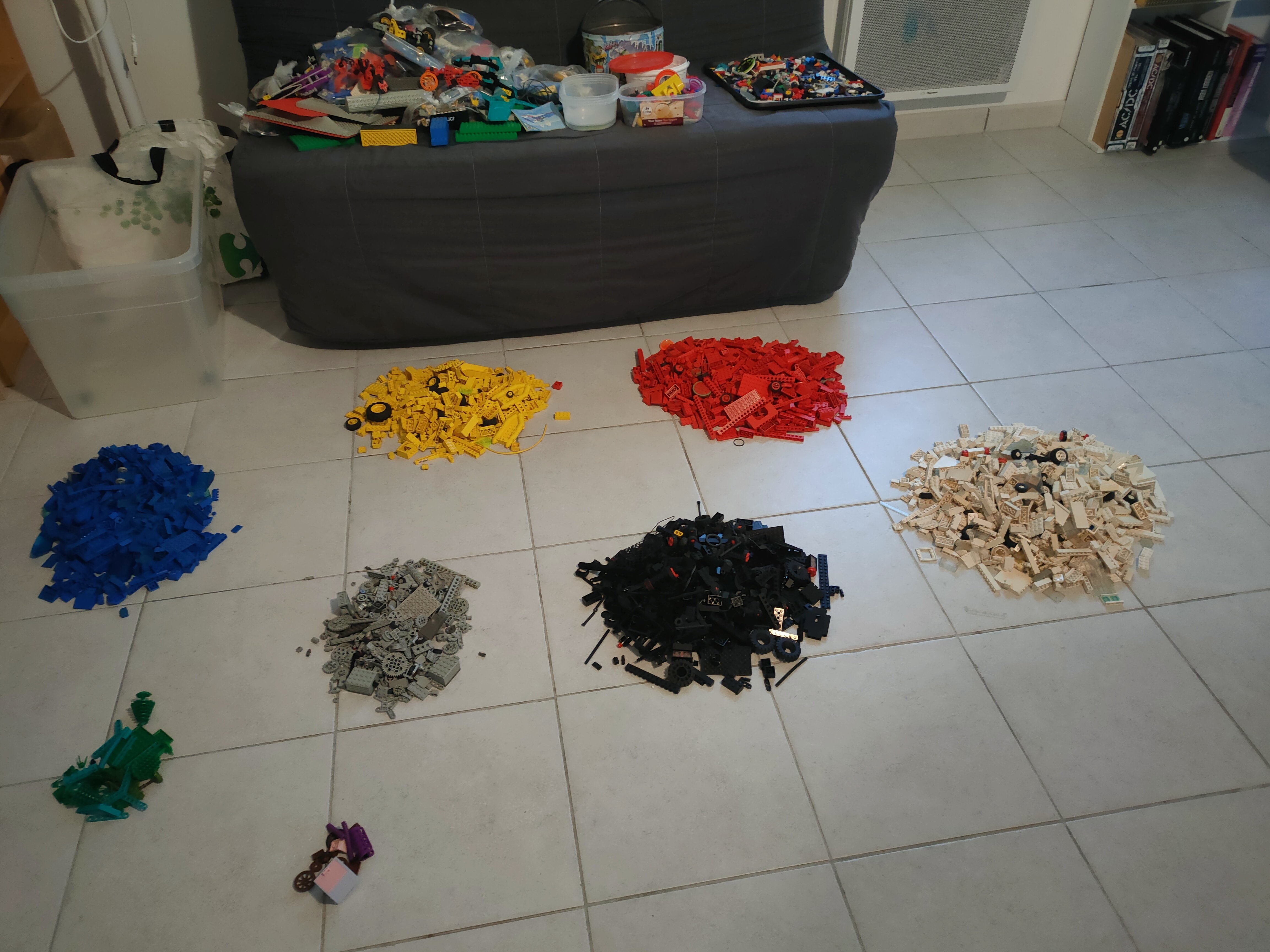 Ils sont déjà trié par couleur, débarrassé des autres types de jouets et de briques, pour le lavage j'ai aussi commencé.