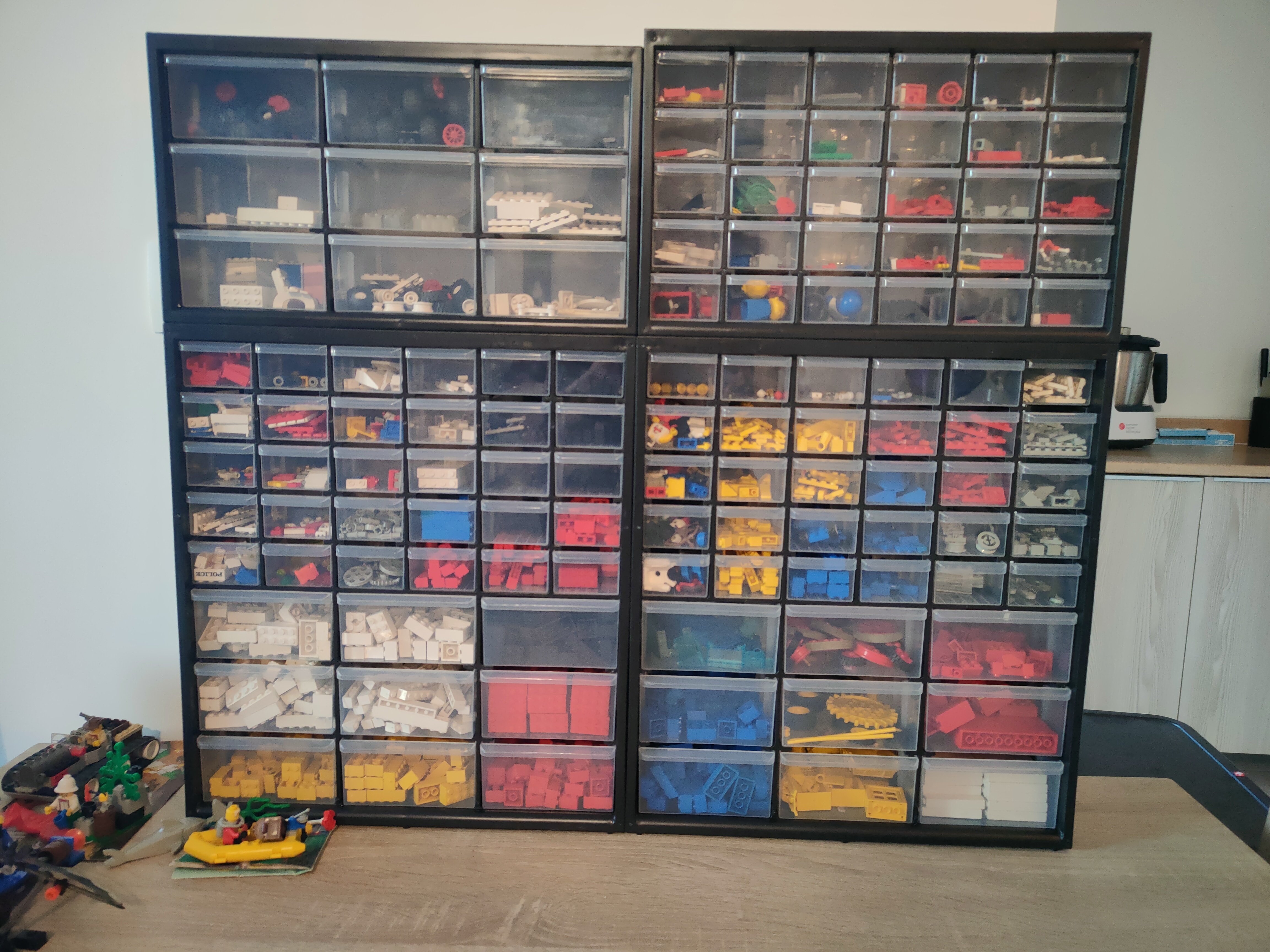 Alors par contre arrêtes le trie par couleur, c'est du suicide, chercher une plate 3*3 dans une caisse de dark grey c'est l'asile au bout du tunnel, tu te brûles la rétine, tu vas a action tu achètes pas mal de caisse et tu fais déjà un gros trie plate/brick/technique/slope... Assez grossier mais déjà tu y verras beaucoup plus clair, on fait tous la même erreur au début.