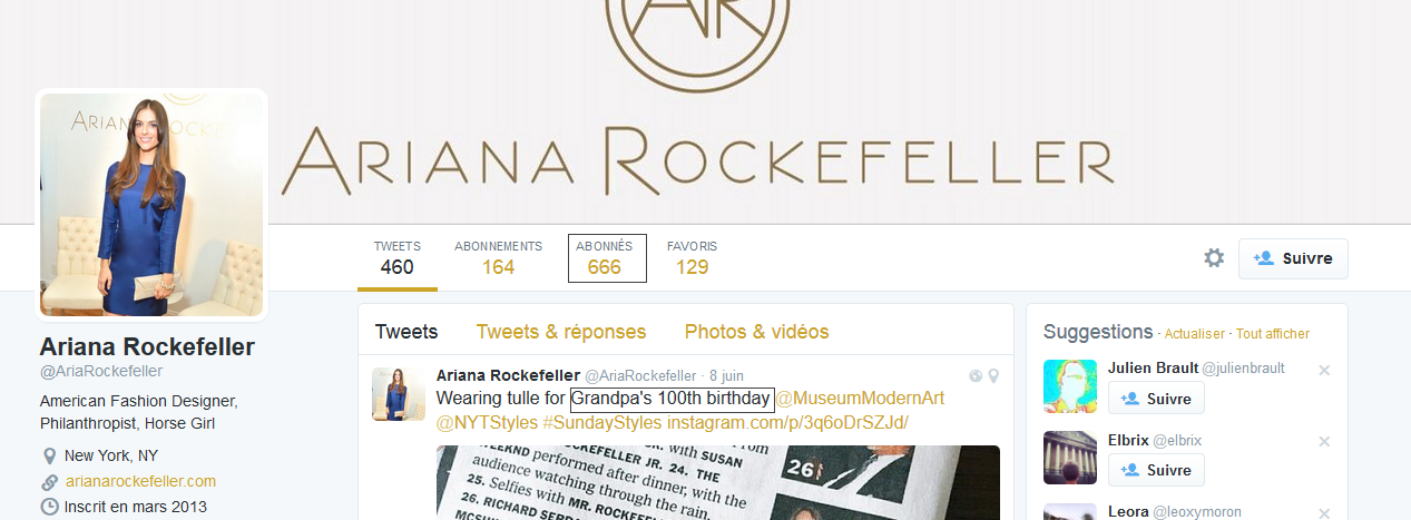 Regarder le nombre d'abonnés d'Ariana Rockefeller sur Twitter