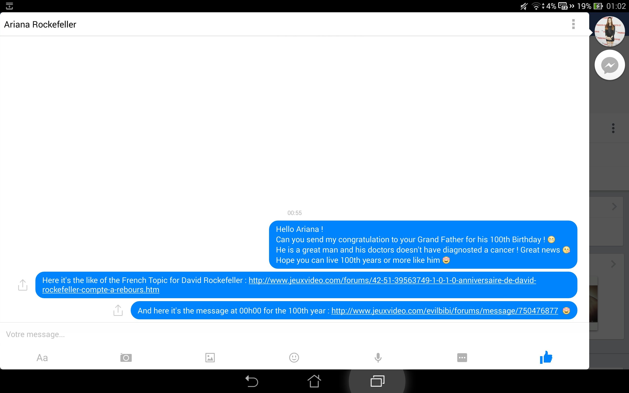 Le 12 juin 2015 à 01:07:10 -Therrannor- a écrit : J'ai envoyé un petit message à Ariana + le lien du topic + le message de l'autre taré à minuit pour les 100 ans de David :