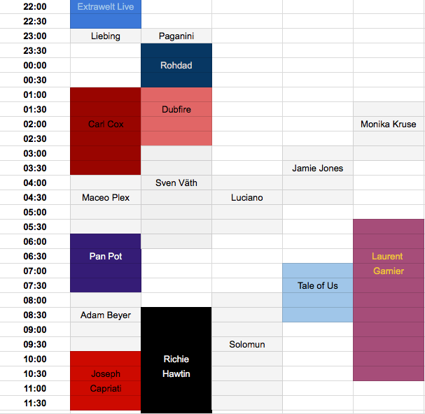 Paganini -> Rodhad -> Carl Cox -> Maceo Plex & Sven Vath --> Pan Pot --> Adam Beyer & Tale Of Us