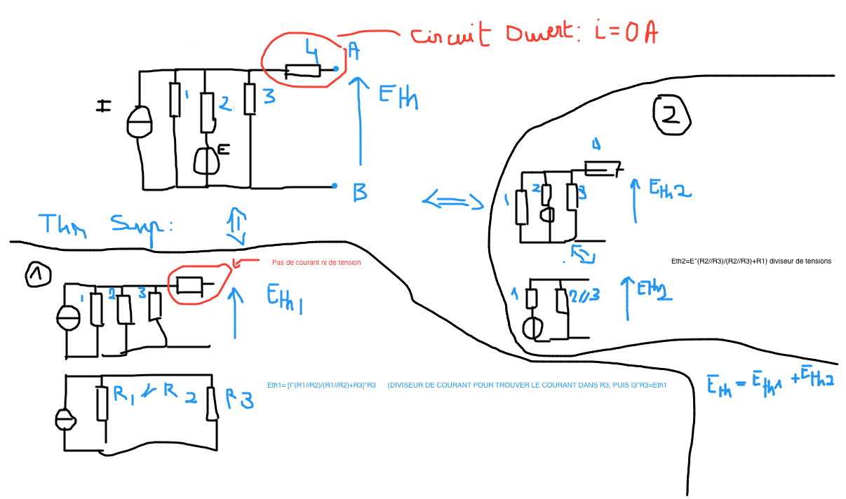 En gros vu que tu cherches Eth tu ouvres ton circuit au niveau de la charge donc t'as pas de courant qui passe dans R4. A partir de ça tu utilises le théoreme de superposition donc un schéma par générateur. pour le schéma ou il reste que le générateur de courant (Eth1) tu fait un diviseur de courant pour trouver le courant qui passe dans l'une des trois résistances j'ai pris R3 mais ça marche avec les autres puis tu fais la loi d'Ohm. En suite pour le schéma ou il reste que le générateur de tension(Eth2) tu mets les resistances en paralelles et tu fais un diviseur de tension _.gif)