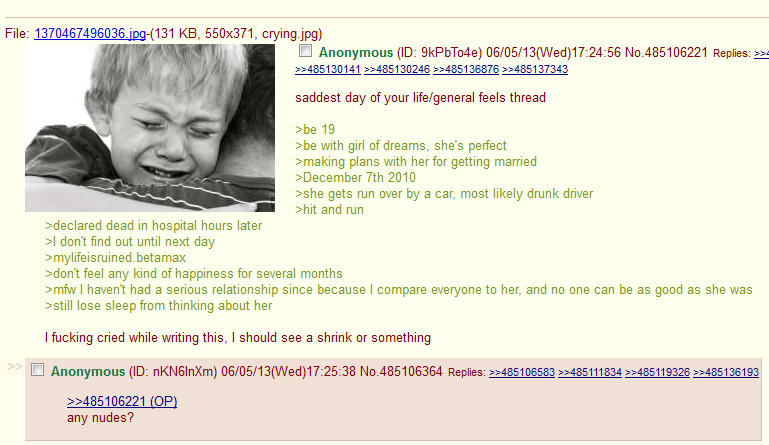C'est déprimant de voir autant de gens désespérés.C'est pas des desespéré, juste que ça montre que ce monde est une merde incommensurable, l'être humain est un déchet nocif à lui-même et à toutes autres formes de vies, j'érpiuve juste du dégoût après certaines histoires