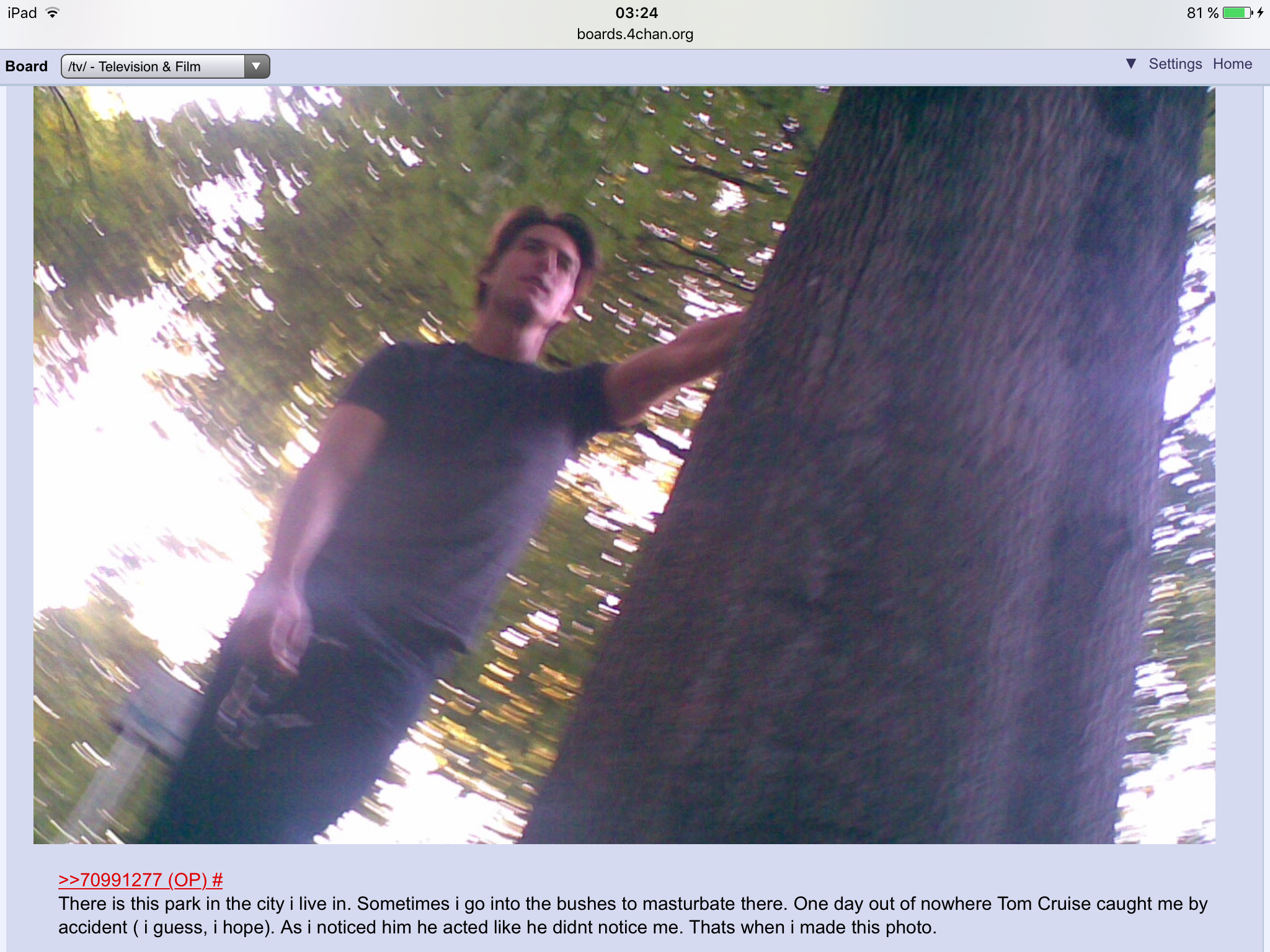 Le mec se branle dans les buissons d'un parc, et un jour, Tom Cruise le surprends, il a fait mine de ne pas le voir se branler, il a pris la photo comme preuve