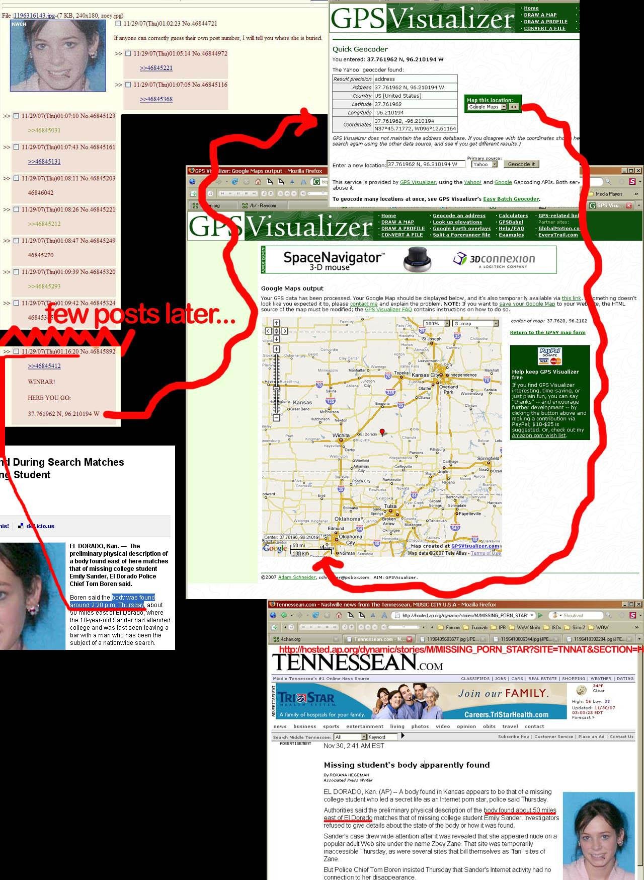 Mais c'était l'histoire d'un mec qui avait fait un thread ou il a posté la tête d'une jeune fille et à côté dans le thread il a écrit : Celui qui post avec 3 même numéro (trips) je lui dis où j'ai enterré cette fille.30 minutes plus tard un gars poste un trips et là l'auteur du thread poste des données de géolocalisation avec latitude et longitude.