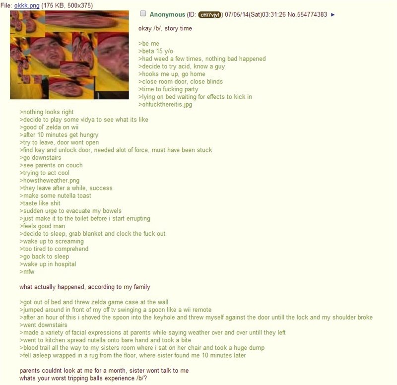Moi, beta de 15 ans. J'ai déjà fumé de l'herbe quelques fois. Rien de mal n'est jamais arrivé. Je décide d'essayer l'acide, je connais un mec. Il passe, et je rentre chez moi. Il est temps de faire une putain de fête. Je m'allonge sur le lit en attendant que les effets apparaissent. hoputainçaarrive.jpg. Tout a un aspect bizarre. Je décide de jouer pour voir comment c'est. Un bon vieux Zelda sur la Wii. Après 10 minutes je commence à avoir faim. J'essaye de sortir de ma chambre, la porte ne s'ouvre pas. Je trouve la clé et j'ouvre la porte. J'ai eu besoin de pas mal de force, ça devait être coincé. Je vais en bas, je vois mes parents sur le canapé, j'essaye de la jouer cool. queltempsfaitil.jpg. Il se barre après un moment, succès. Je me fais quelques tartines de nutella, ça a un goût de merde. J'ai soudain envie de me vider les intestins. J'arrive juste à temps aux toilettes avant que ça ne commence à sortir. Ca fait du bien. Je décide d'aller dormir, j'attrape ma couverture et je m'écroule. Je suis réveillé par des cris. Je suis trop crevé pour comprendre, je me rendors. Je me réveille à l'hôpital.