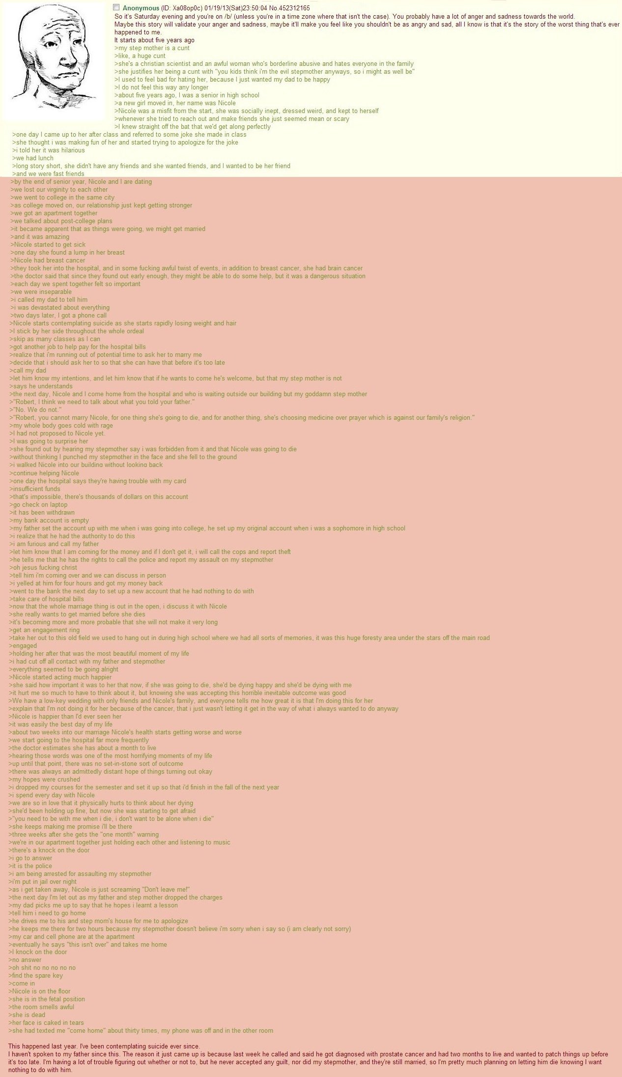 Je viens donc d'en traduire une nouvelle bien badante. J'ai dis plus tôt aujourd'hui que l'histoire triste qui m'avait le plus marqué avait été celle avec Ella que j'ai posté ici mais juste l'originale, la traduction va être super longue (d'ailleurs je ne sais pas comment poster ça si je le fais savant que ça va facilement prendre sept posts bref à voir), mais je suis retombé sur celle-la et putain, je me suis souvenu que la fin m'avait vraiment mis un coup au moral. Bref, avis aux amateurs, seuls qui veulent rester de bonne humeur, je les invite à lire autre chose, on a traduit des trucs plutôt drôle plus tôt aujourd'hui.