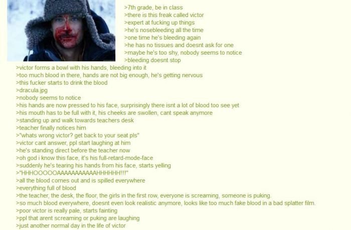 Un jour qu'il saignait ENCORE du nez, il avait pas de mouchoir et en a même pas demandé un.