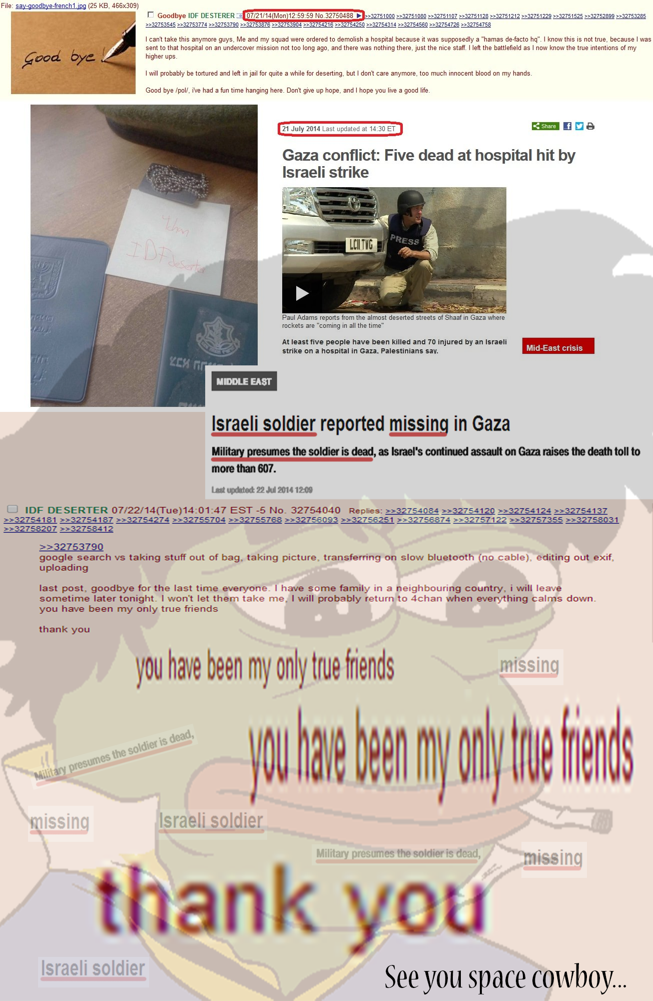 Je n'en peux plus les gars, moi et mon escouade avions l'ordre de démolir un hopital car il était supposé être un " qg de facto du hamas " je savais que c'était faux, car il n'y a pas longtemps j'ai été envoyé à cet hopital pour une mission secrète, et il n'y avait rien, ils faisaient du bon boulot. J'ai quité le champ de bataille, connaissant les véritables intentions de mes supérieurs. Je vais probablement être torturé et jeté en prison pour un moment pour " désertion " mais je ne m'en soucie pas plus que ça, j'ai trop de sang innocent sur mes mains. Adieu /pol/ ( politiquement incorrect ) j'ai passé du bon temps ici, ne perdez pas espoir et j'espère que vous aurez une belle vie.