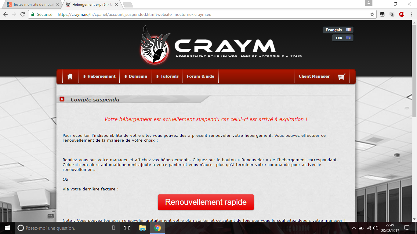 Le 20 janvier 2017 à 19:09:16 DouglasStamper a écrit :le site est down ? Ca me met hébergement expiré