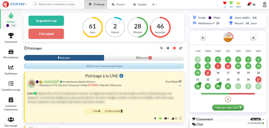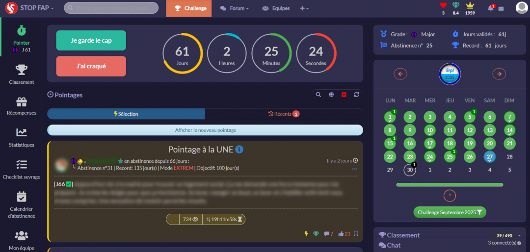 L'autre possibilité que j'ai pour ma part suggéré serait plutôt de permettre de pointer mais sans pour autant lancer une nouvelle abstinence. Cela aurait pour effet de créer un pointage sans durée d'abstinence affiché et qui ne serait visible que sur son profil.