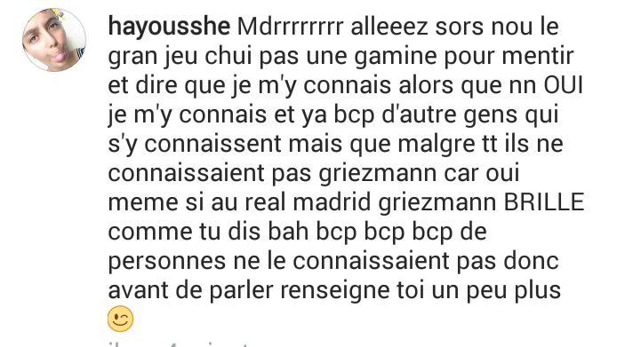 "O tu sor le gran jeu mai moi jmy conai et tt ceu ki sy conaise ne conaise pa griezman mem si il jou au real mtn tchous et va te renseigner" MAISC'est un troll, avoue ?