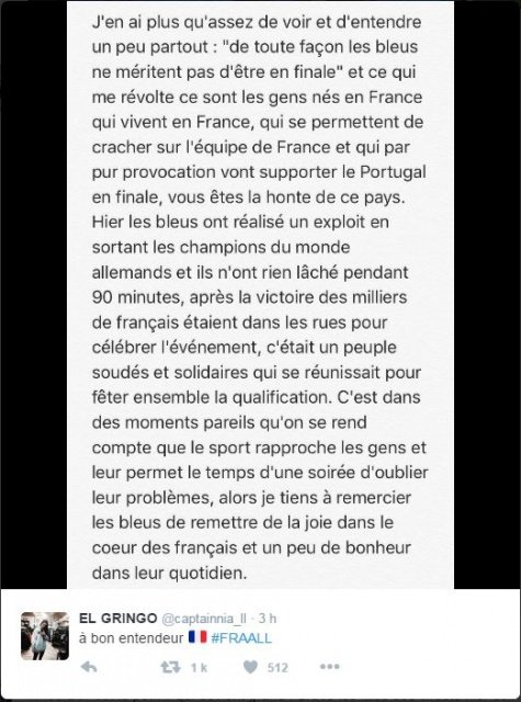 Au début de l'euro et durant les matchs de préparation ça sifflait Giroud maintenant ça lui suce le bout. Ça faisait des scandales sur Griezmann et Pogba et maintenant ce sont des futurs ballon d'or. Faut pas vous étonnez d'être la risée du Globe.