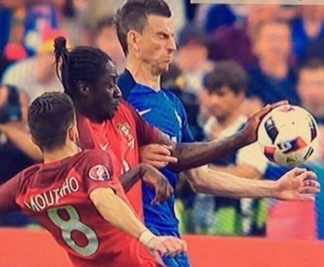 Bah en fait le but portugais arrive sur une action juste après le coup franc du à cette fausse main..