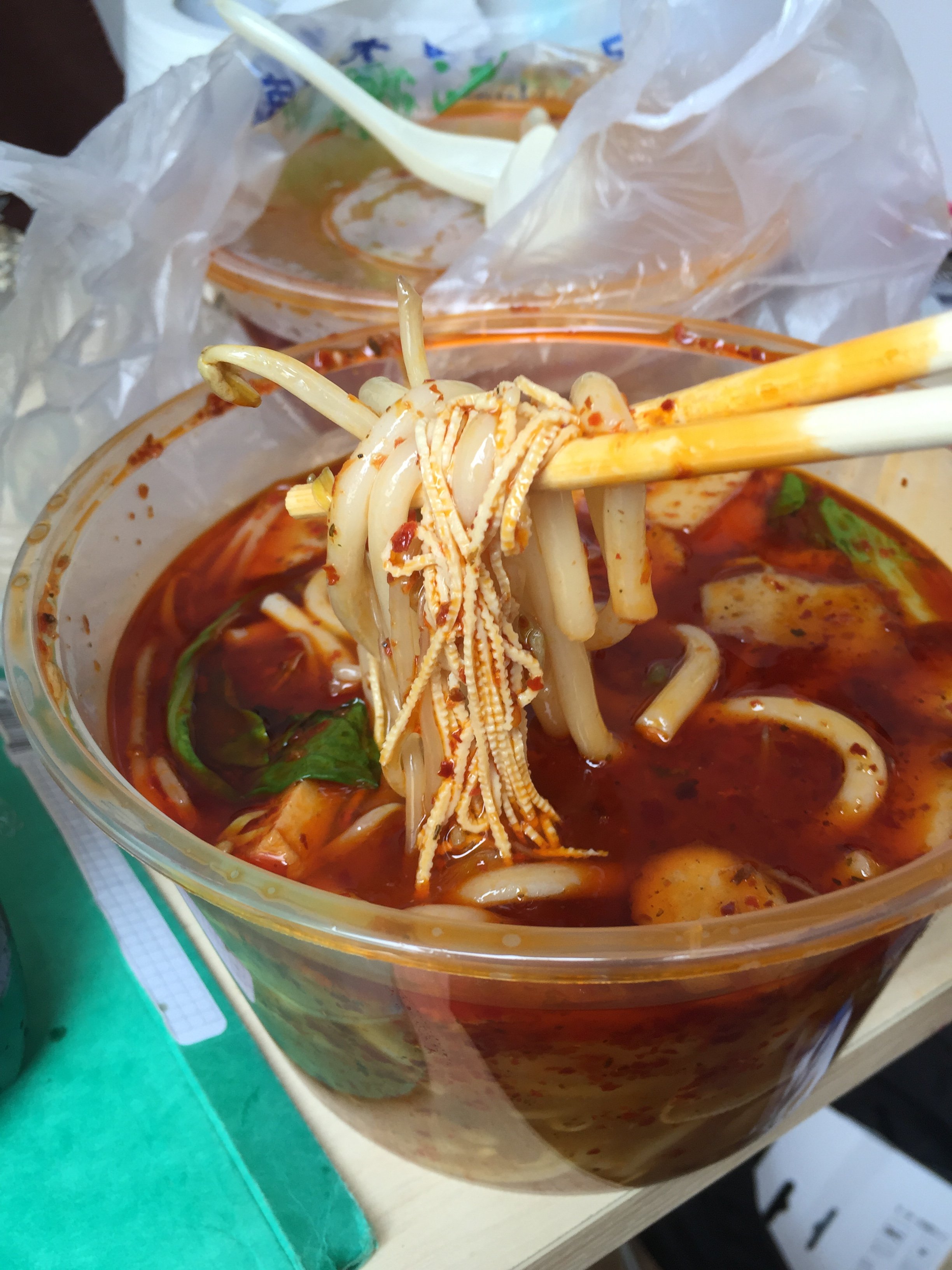 Elle a commandé de la bouffe vers 11h, des nouilles faites avec du riz, avec poisson et tofu. C'est incroyablement épicé même pour moi qui suis habituéles chinois sont absolument brutal à manger ça au réveil