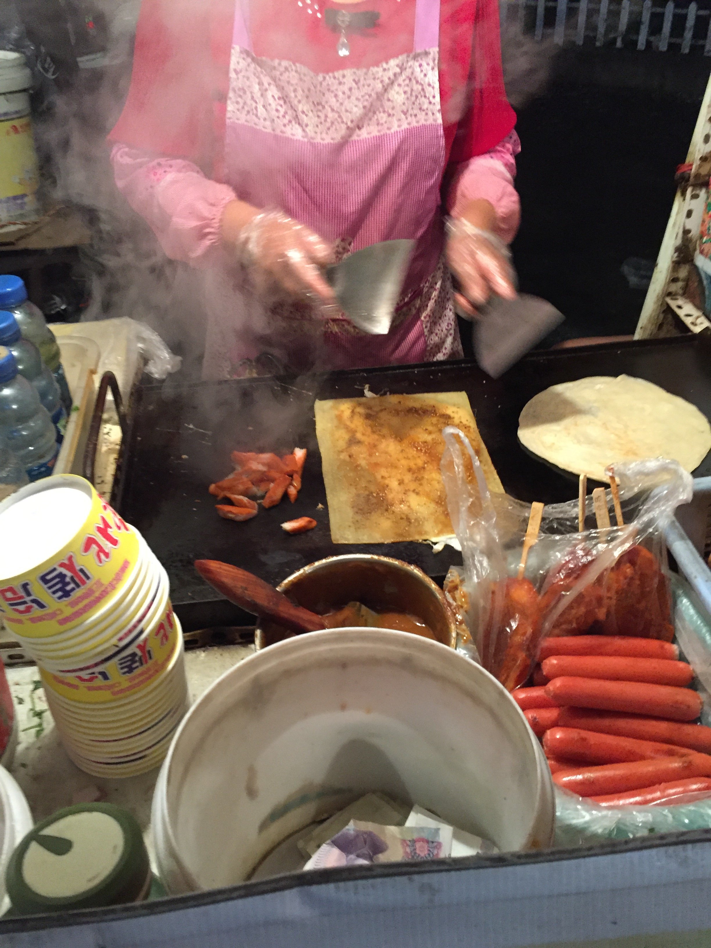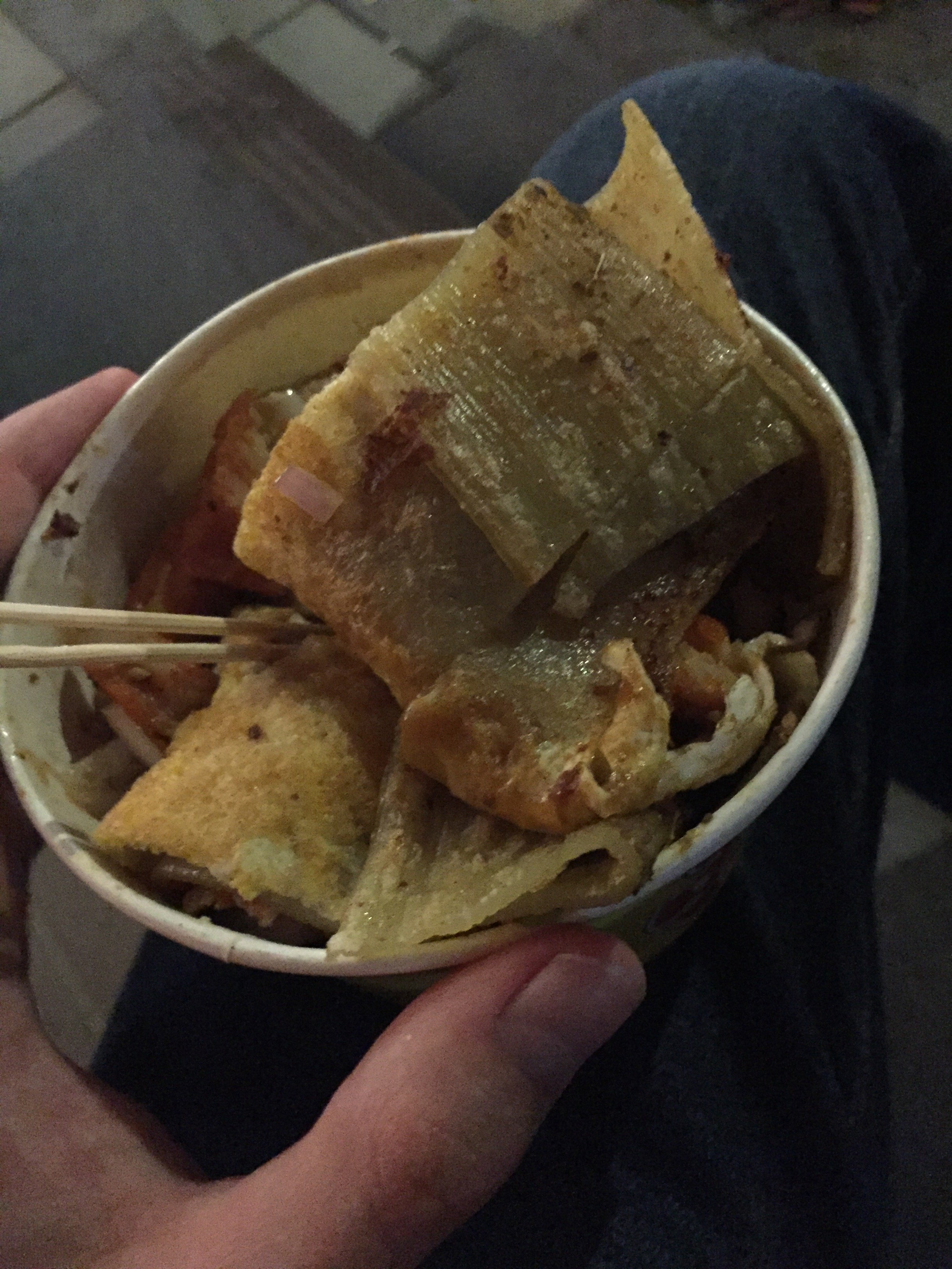Elle prends une sorte de carré de pâte, elle fait frire avec un oeuf et rajoute plein d'épice avant de le découper dans un pot, ça ressemble à rien mais honnêtement c'était super bon