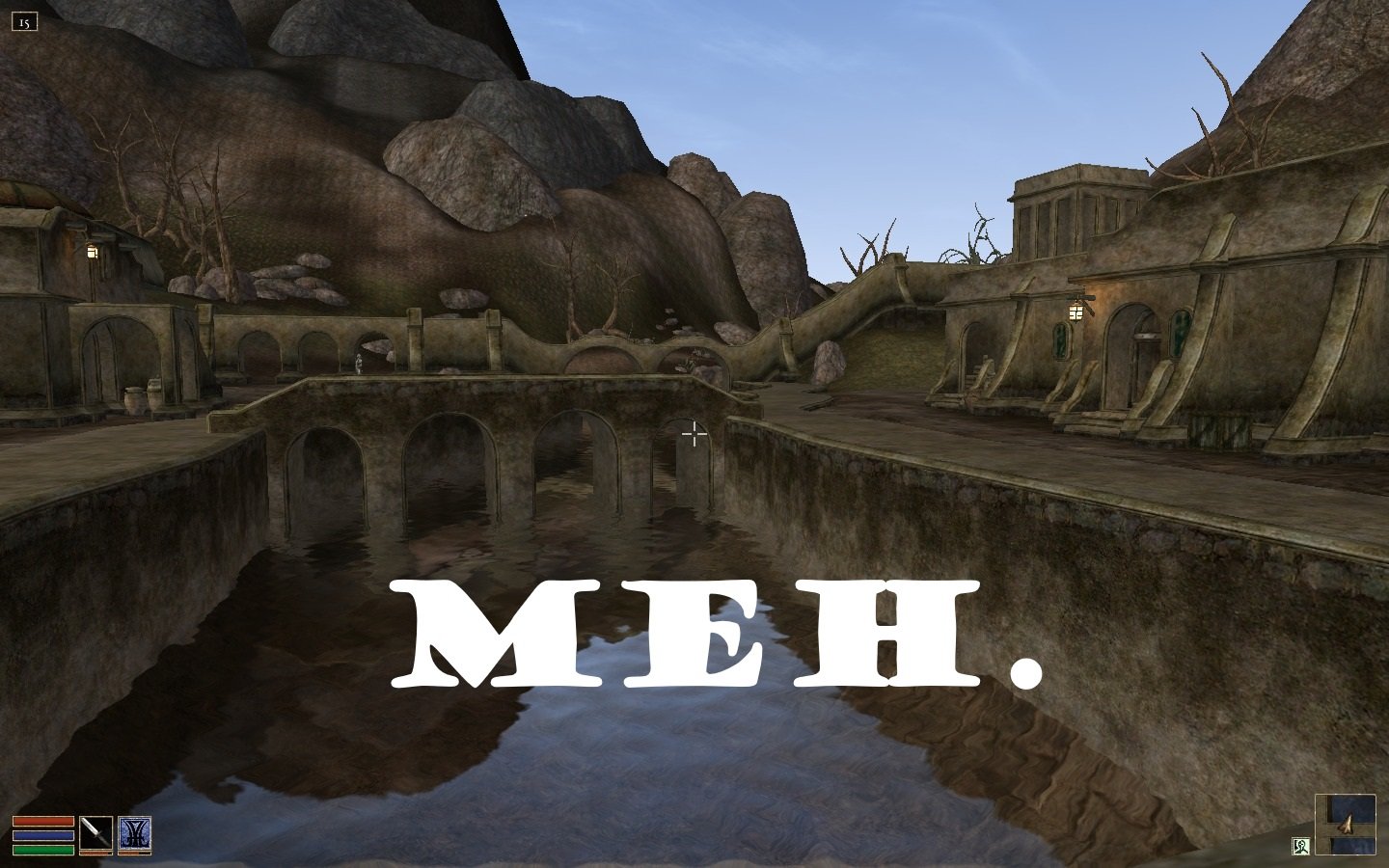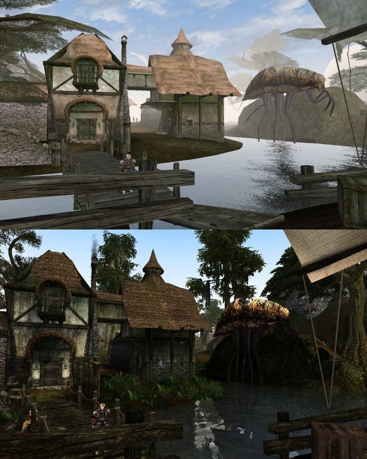 Mais. L'aspect graphique, même si vous avez envie de vous y mettre, est imbuvable pour vous. Vous n'y pouvez rien. C'est trop archaïque, et on voit pas assez loin. La luminosité est trop terne. Merde. Que faire. Allez les Kheys arrêtez de vous en faire, la solution, ce sont les mods ! Parce que si l'eau et le ciel sont splendides dans Morrowind, le reste a certainement besoin de quelques coups de fouets.