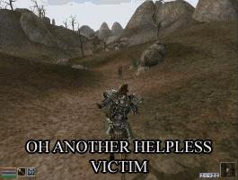 Apprenez à raisonner en terme de RP, parce que si Oblivion et Skyrim ont été réalisé pour le jeune Quentin, avide d'épée et d'aventures propres et rapides comme à la télé, Morrowind, lui, est là pour le RP, pour vous faire découvrir un monde. Un monde qui vit pour lui, pas pour vous. Il s'en branle de vous. Vous ne saurez y vivre que si vous vous adaptez à ses propres règles, pas l'inverse. Puis bon allez, entre nous ! Vous en avez assez de crever au début du jeu parce que c'est dur ? Souriez mes Kheys, je vous donne la soluce !