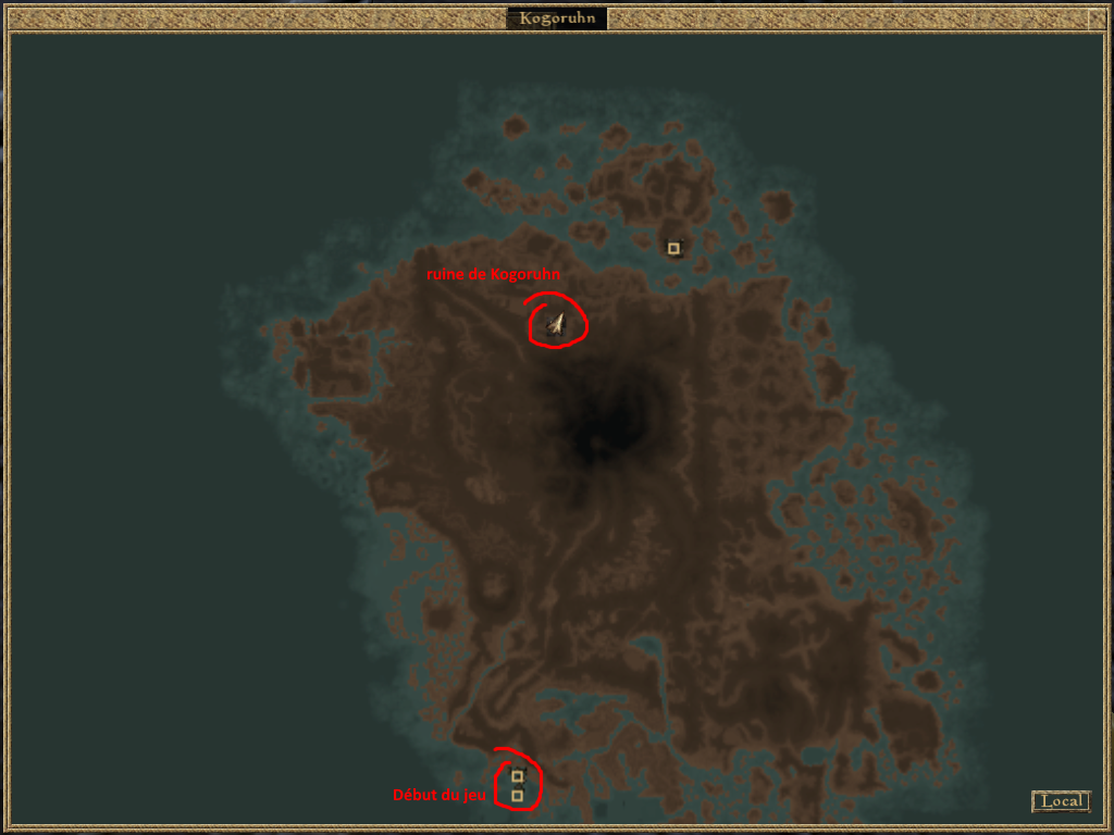 Vous vous souvenez quand j'ai dit que dés le début du jeu, vous pouvez vous rendre n'importe ou sur la map, peu importe votre level ? Eh bien ça veut dire que vous pouvez dés les premières secondes du jeu foncez dans le repère du grand méchant de l'histoire, qui vit sous le volcan, pour essayer de vous le faire en mode déter, mais aussi et surtout que vous pouvez prendre ce que vous voulez ou vous voulez si vous savez ou chercher. Sur la carte, en rouge, je vous montre votre point de départ, en haut, des ruines. Dans ces ruines, vous trouverez ce mec :