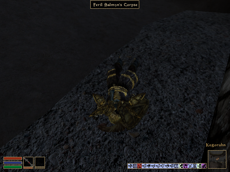 C'était un Ordonnateur, l'un des saints garde du Temple, la religion locale. Il est mort là, au combat. Prenez son arme et son armure, et vous voilà avec un excellent équipement pour les débuts du jeu si vous jouez épéiste ! Attention, l'armure étant sacré, si vous vous baladez dans la ville de Vivec avec et que les Ordonnateurs se rendent compte que vous n'êtes pas des leurs, ils le prendront comme une moquerie hérétique et chercheront à vous mettre à mort. Aussi, ne prenez que l'arme et l'armure, les autres objets étant éventuellement des objets de futurs quêtes.