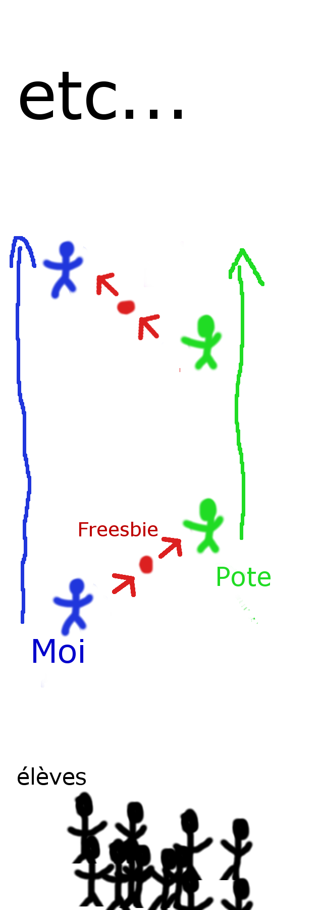 Et en gros y'avait une activité ou on devait se mettre par deux et se mettre à courir côte à côte avec genre 3 mètres d'écart, et s'envoyer le frisbee chacun son tour pendant que les autres nous regardaient