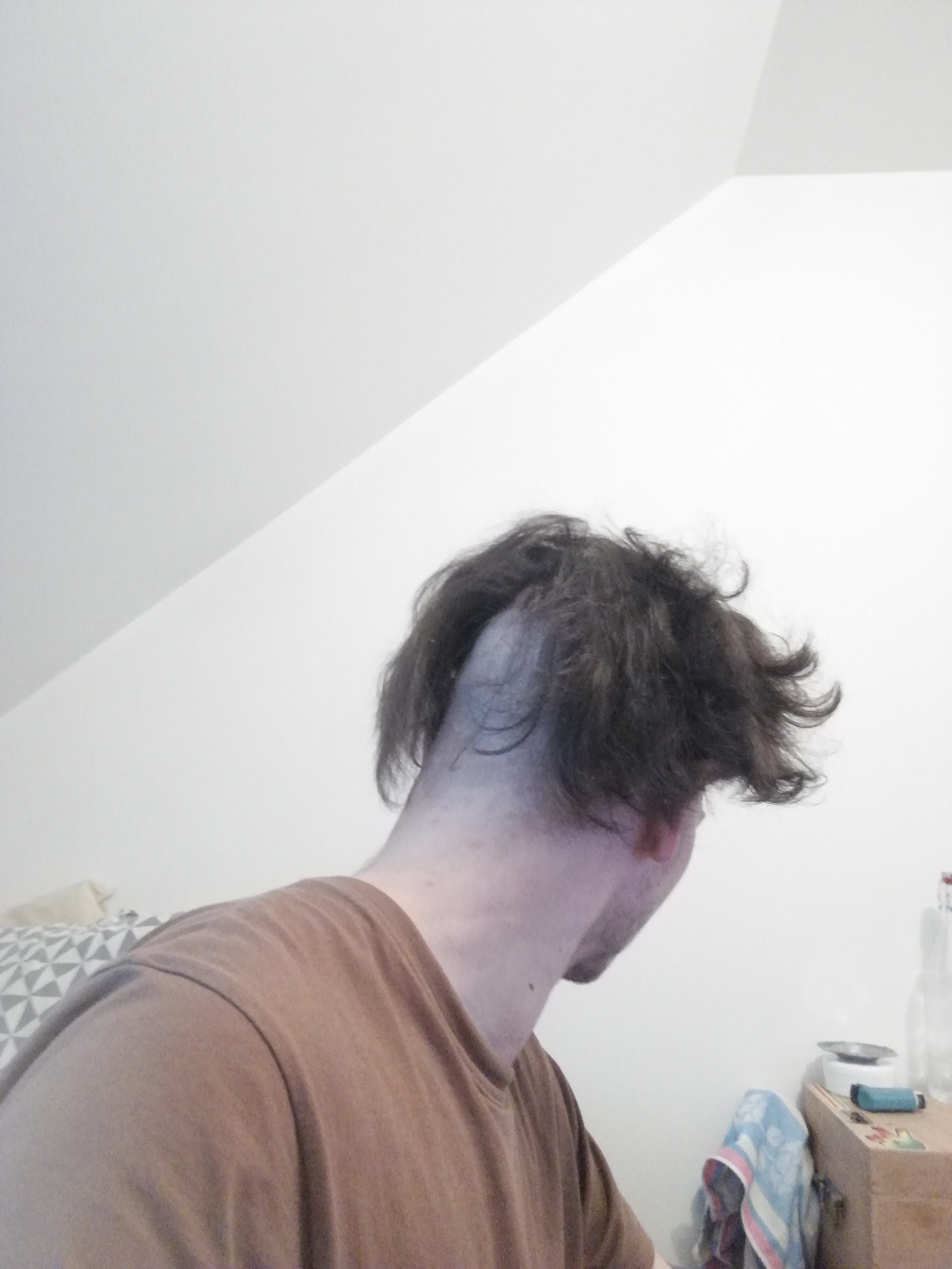 Mais bon les cheveux longs au bout de 5 ans ça commence à faire chier. Alors J'ai demandé à un pote de me faire une coupe mais c'est parti grave en couille