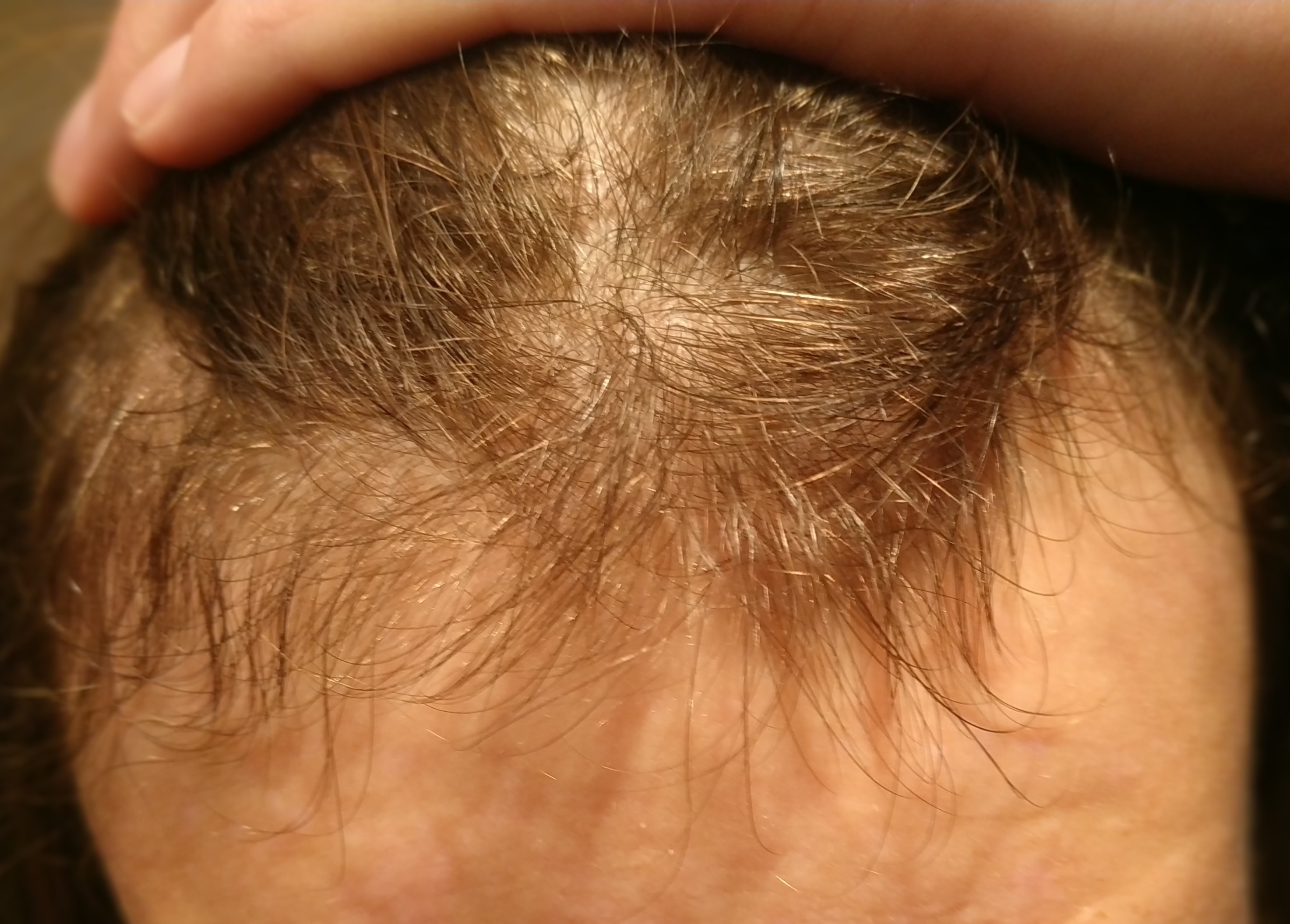 T'es sûr que c'est un début de calvos et pas un effet du à des cheveux fins + épi au niveau du sinciput ?