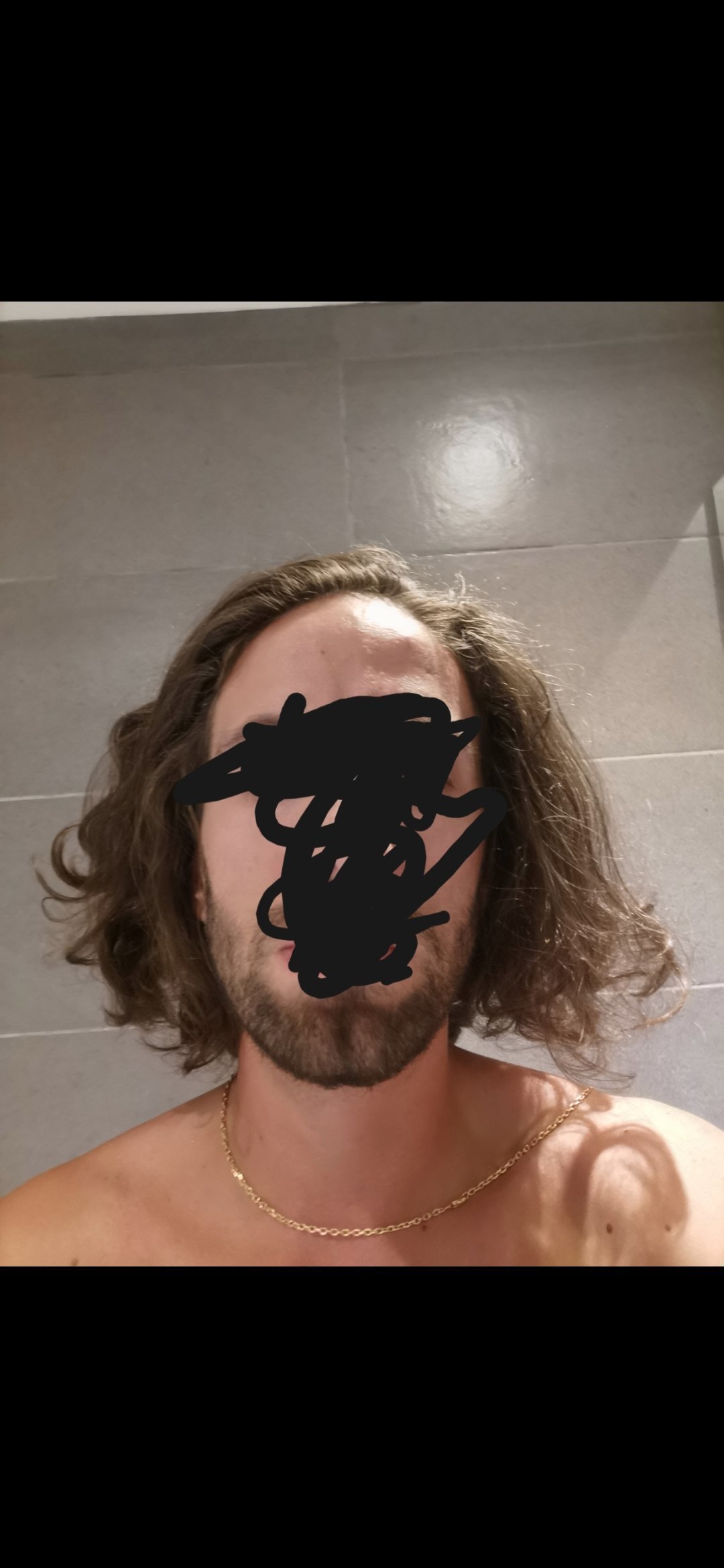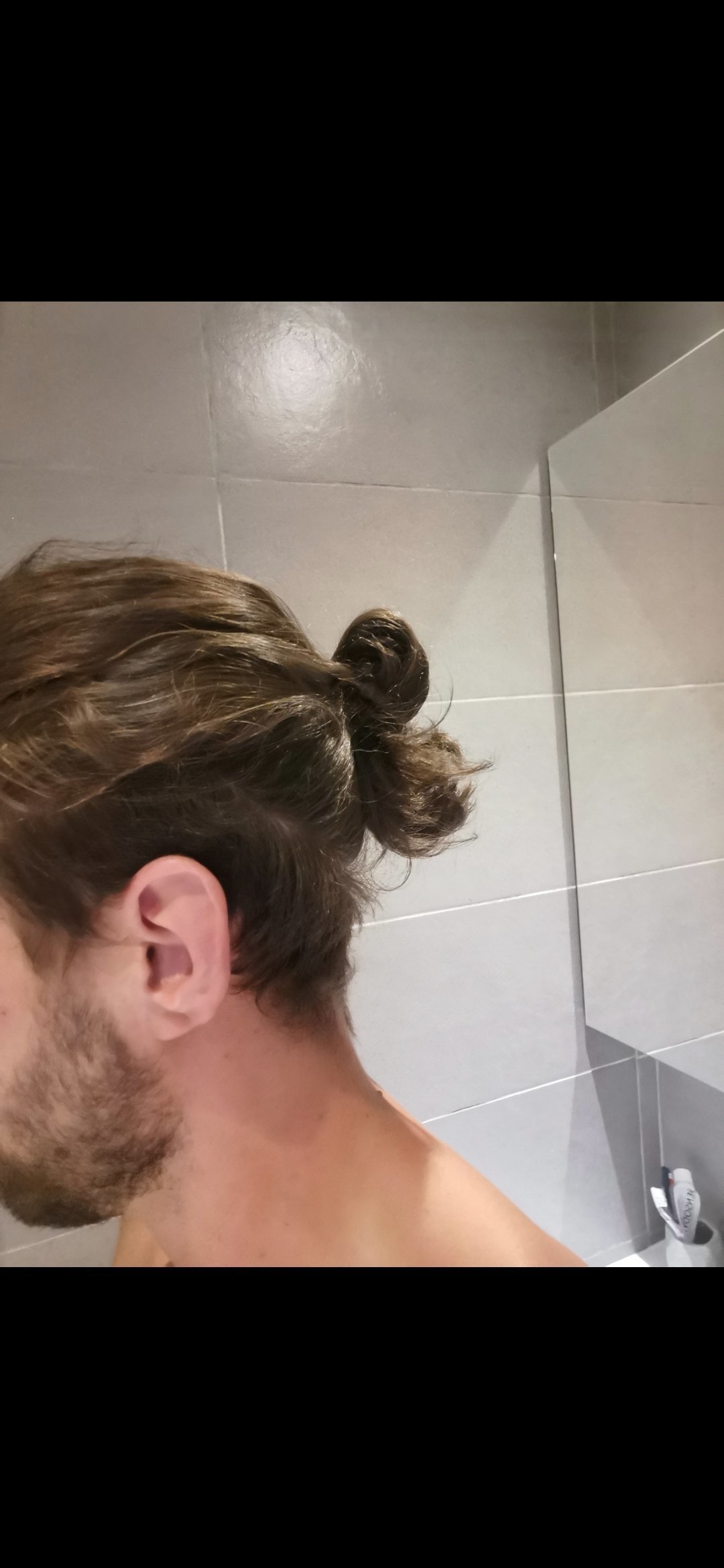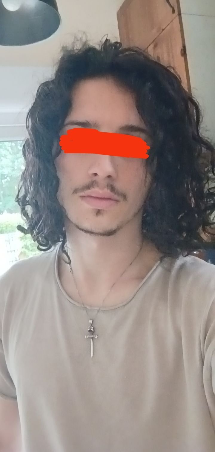 Ça fait 3 ans que j'ai les cheveux longs mais je les assume pas car bcp trop volumineux et ondulés c'est un enfer du coup je les attache tout les jours en Man bun donc de face j'ai cette tête :