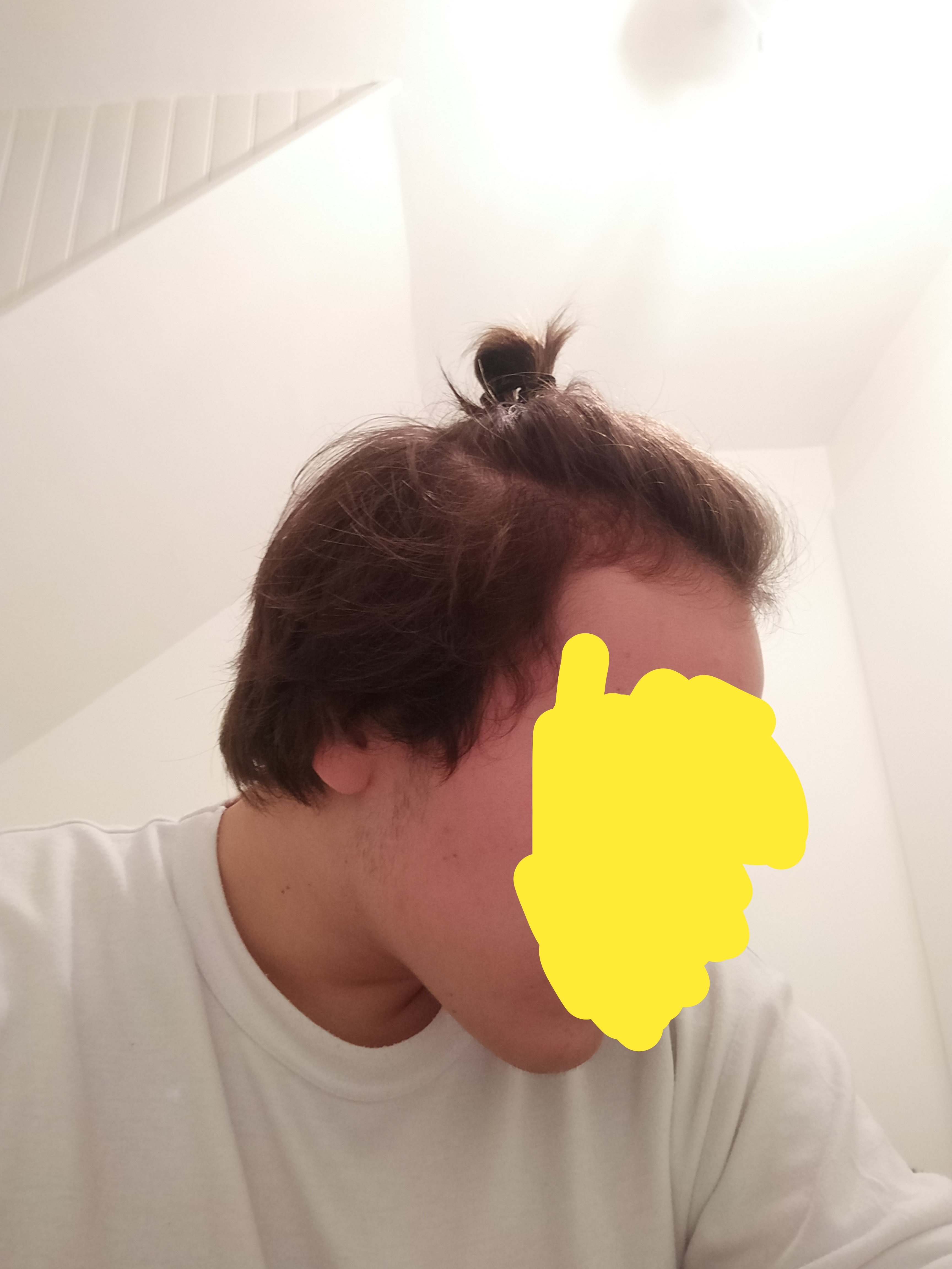Mon but c'est de me laisser pousser les cheveux, j'ai démarré d'un undercut que je faisais entretenir tous les 3 mois en moyenne, sans vraiment toucher aux cheveux du dessus donc quand je tire une mèche de cheveux devant mon visage elle atteint le menton, c'est pour que vous puissiez imager la longueur que j'ai actuellement.