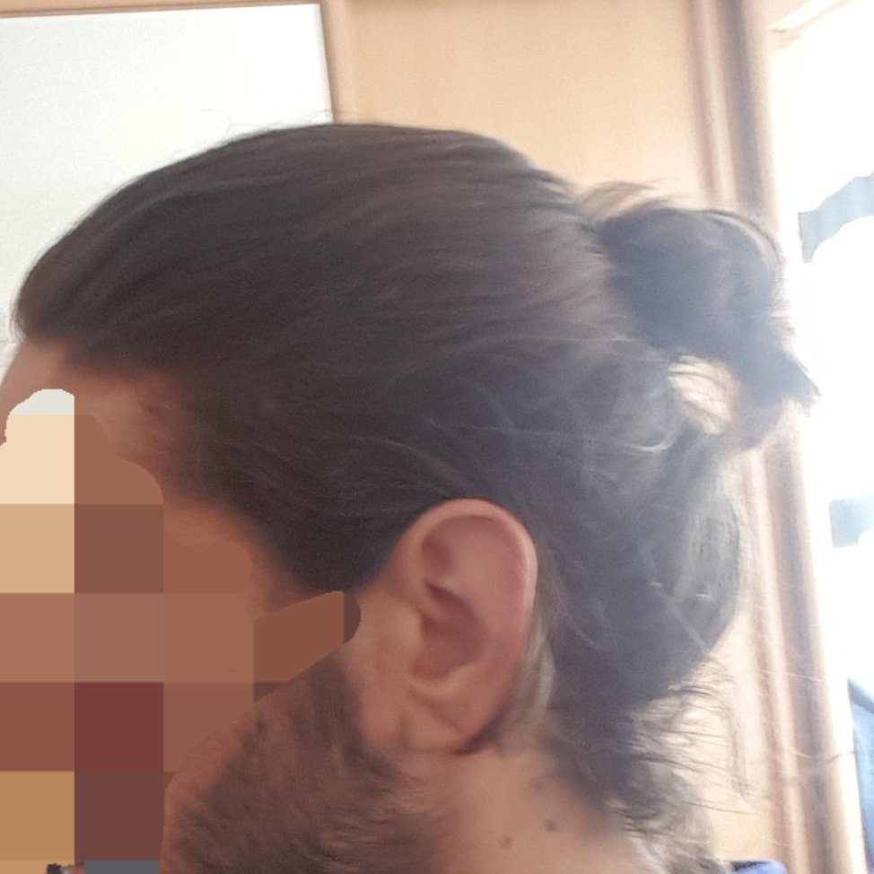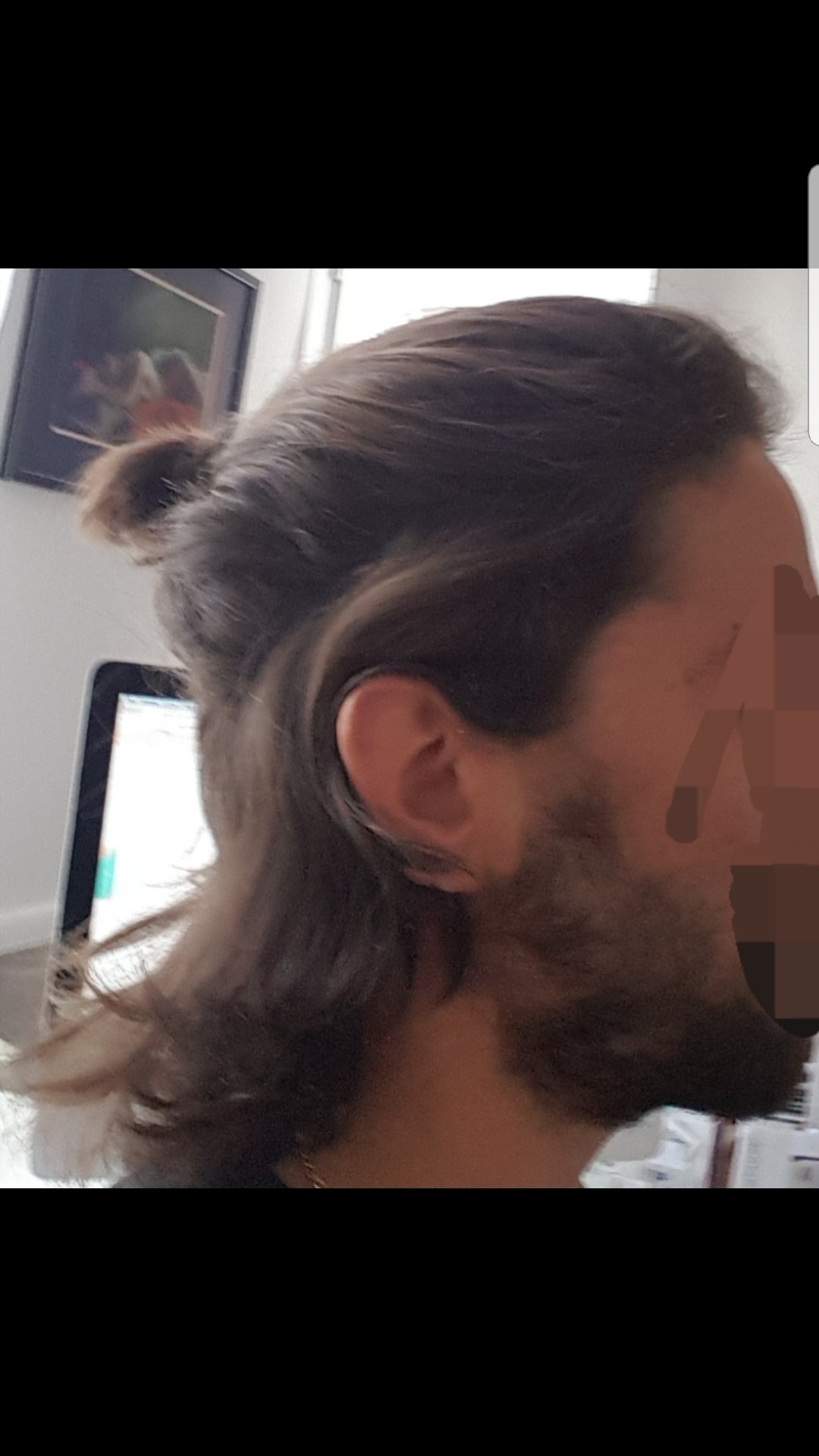 Seulement voilà pour faire un man Bun je nai pas assez de longueur pour tout attacher donc soit je nattache pas ceux de la nuque et j'ai une coupe façon samurai soit jattache en bas mais pas au dessus et dans ce cas je suis obligé de mettre du spray pour plaquer ceux du dessus en arrière et au moindre coup de vent tout part en bataille.