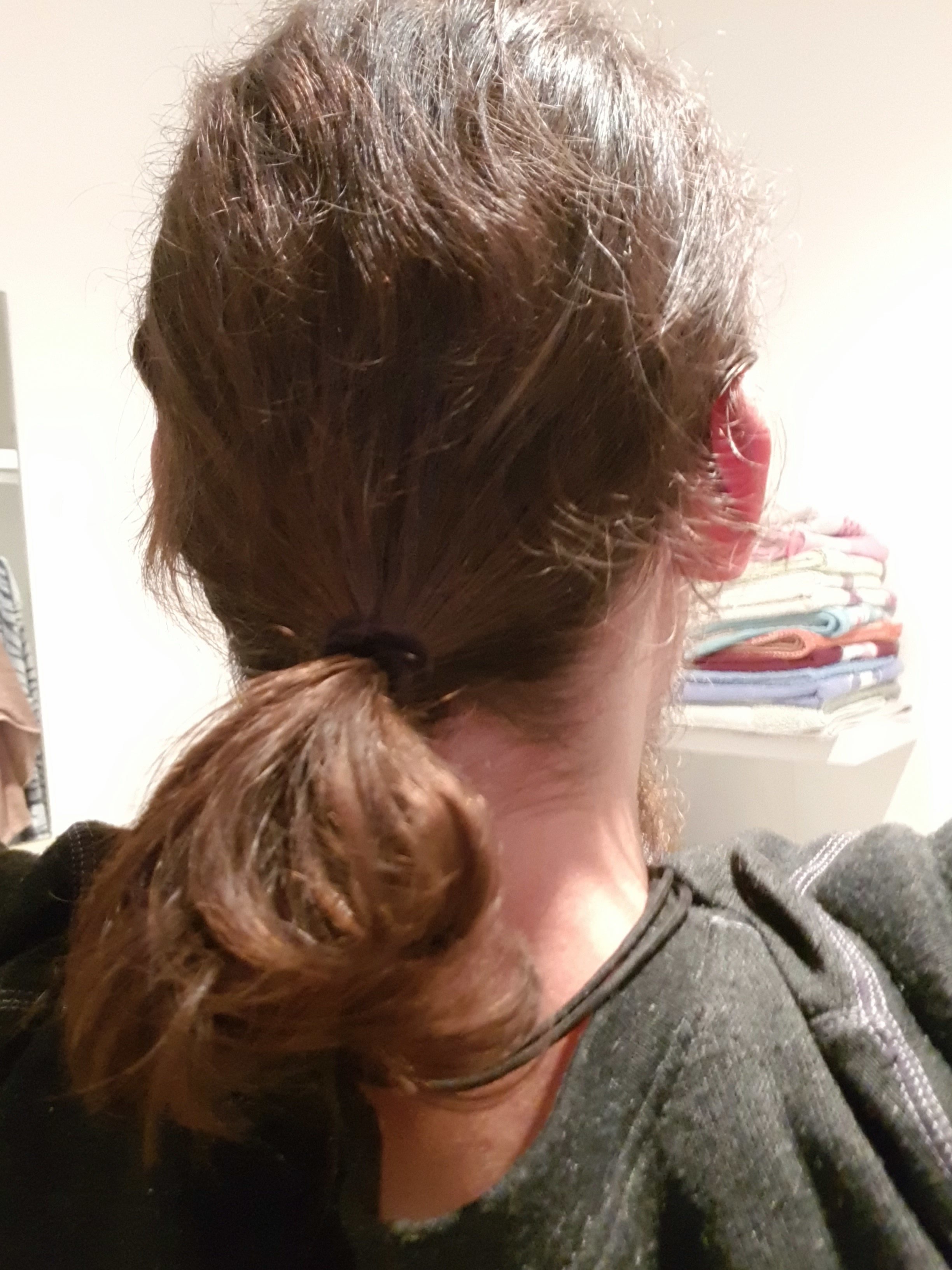 Bon j'ai fait un shampoing cette aprem, j'arrive mieux à les attacher, je ne sais pas si ça se voit sur les photos mais au niveau des oreilles il y a des mèches qui sont trops courtes pour être attacher.