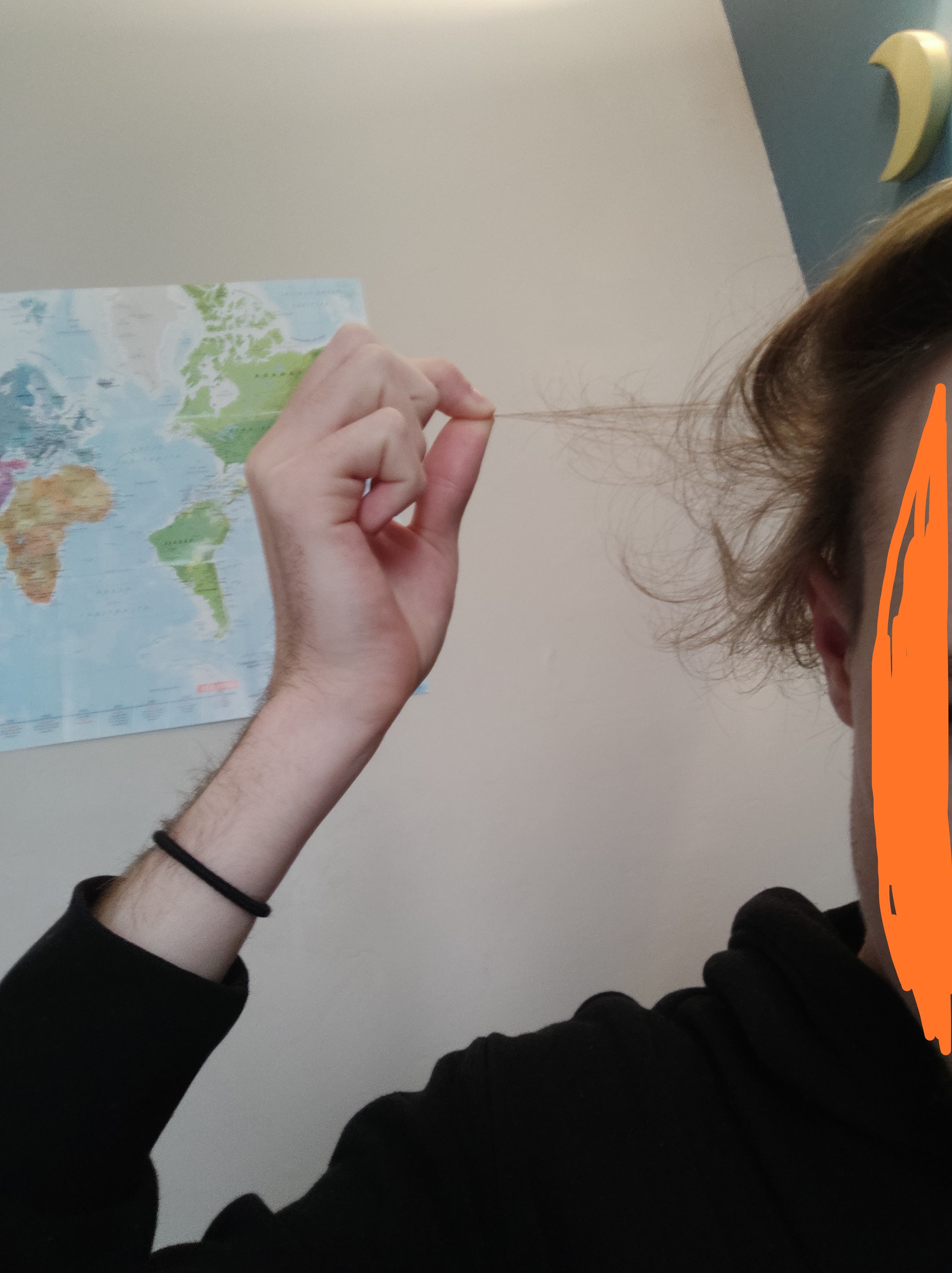 Avec le confinement, j'ai pas pu la voir pendant un moment et la permanente s'est dissipée et les cheveux sont redevenus lisses sur le dessus. Du coup j'ai décidé de me les laisser pousser, en mars environ. Je laisse pousser sur le dessus et un peu sur le côté, après environ au niveau du sommet des oreilles je rase. Comme j'avais rien sur les côtés avant, je peux mesurer ce que j'ai gagné en 10 mois de repousse. Ça donne ça :