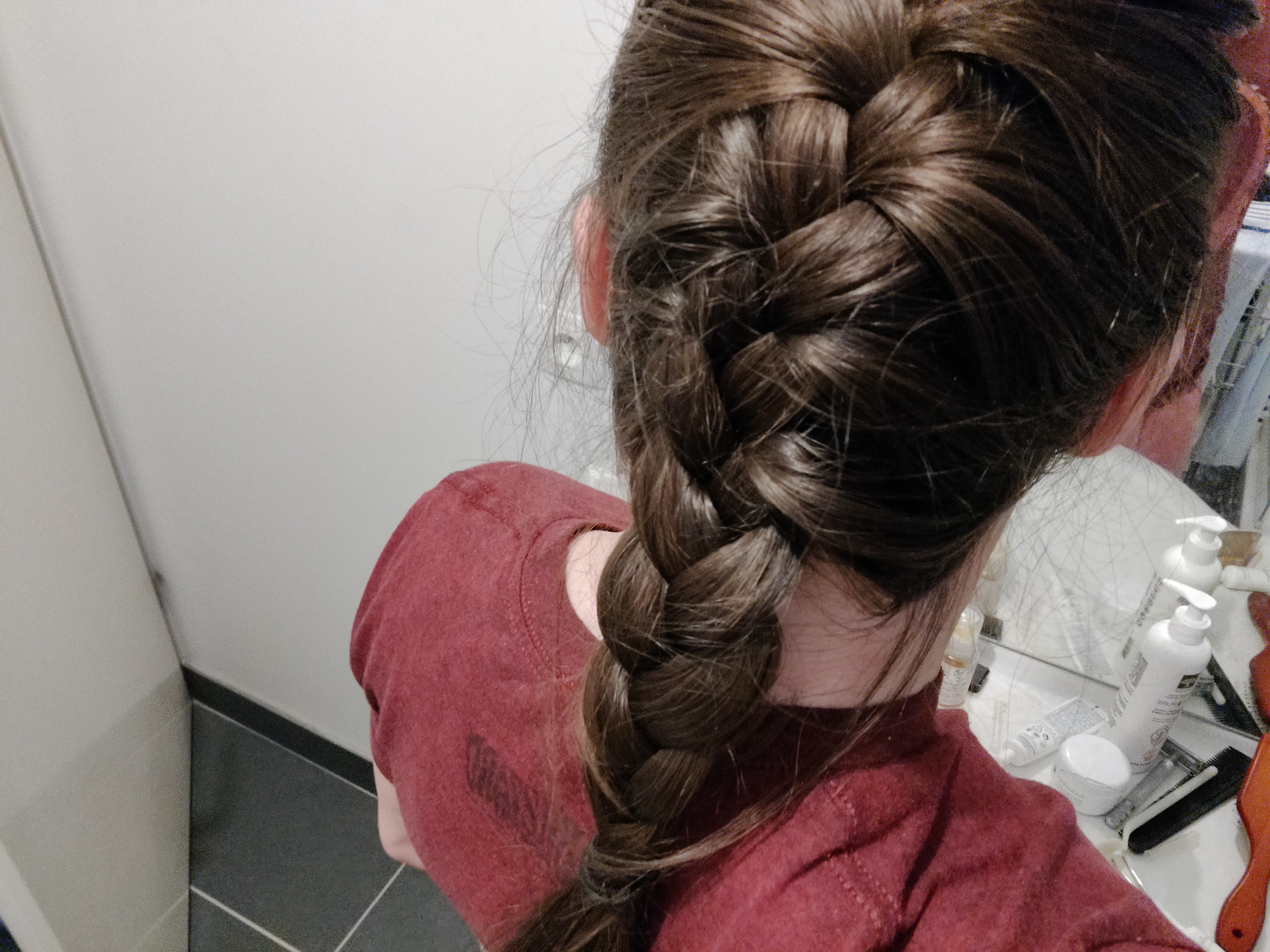 Petit message pour donner de la motivation à ceux qui sont en pleine pousse :Ma longueur actuelle avec différentes coupes dont une tresse faite à la va-vite en 2-3mn donc pas très parfaite.