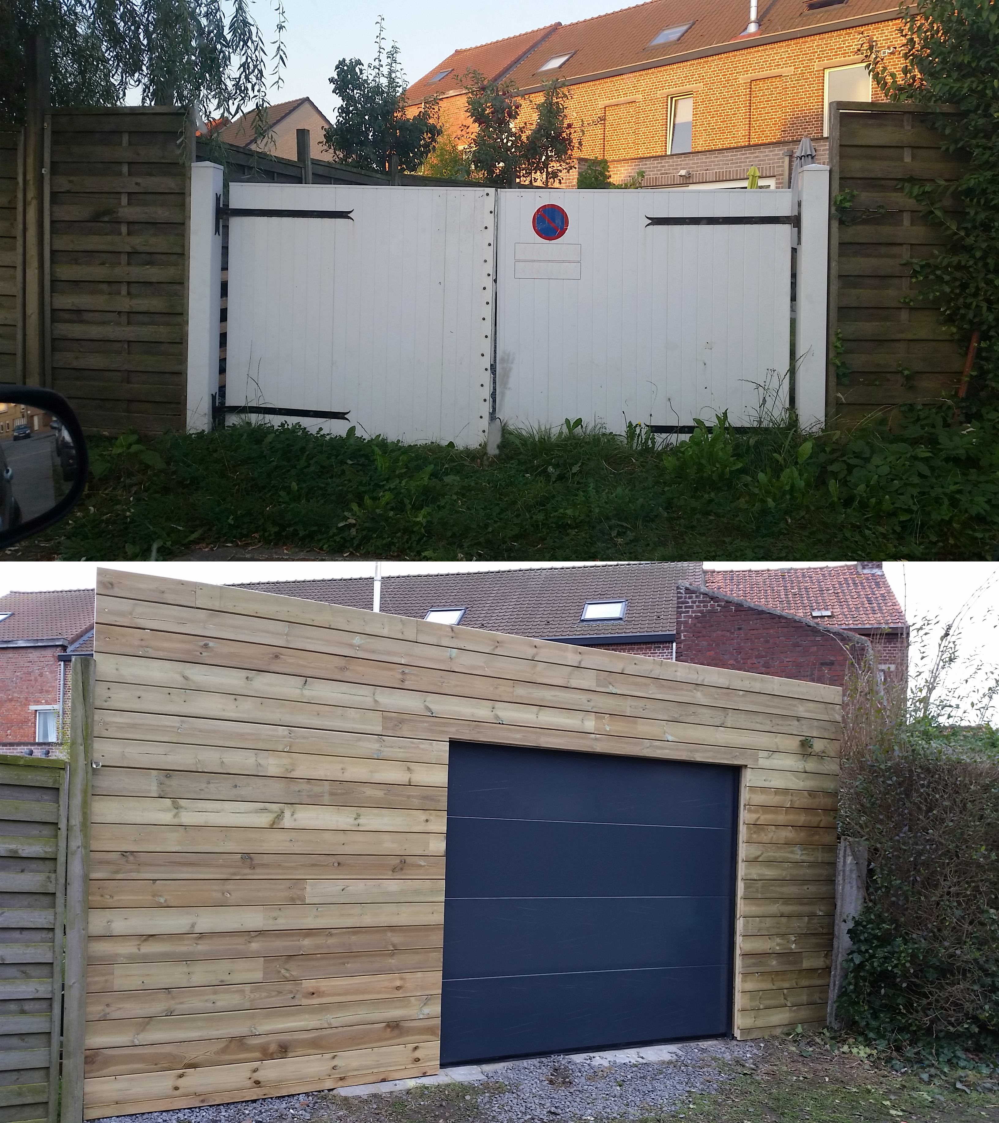 Ce qu'on a fait ce weekend : installer la porte de garage et barder avec du bois (photo 1).