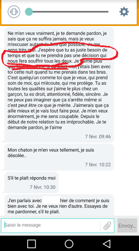 Sa façon d'envoyer des pavés à la chaîne me fait mal au coeur, j'ai envie de la pardonner, on comprend qu'elle regrette. Cependant ce qu'elle a fait est inacceptable elle t'a menti comme pas possible t'as trahi, s'est trahi elle même. Dans tout les cas si tu la quittes elle se remettre surement avec son ex comme bouche trou