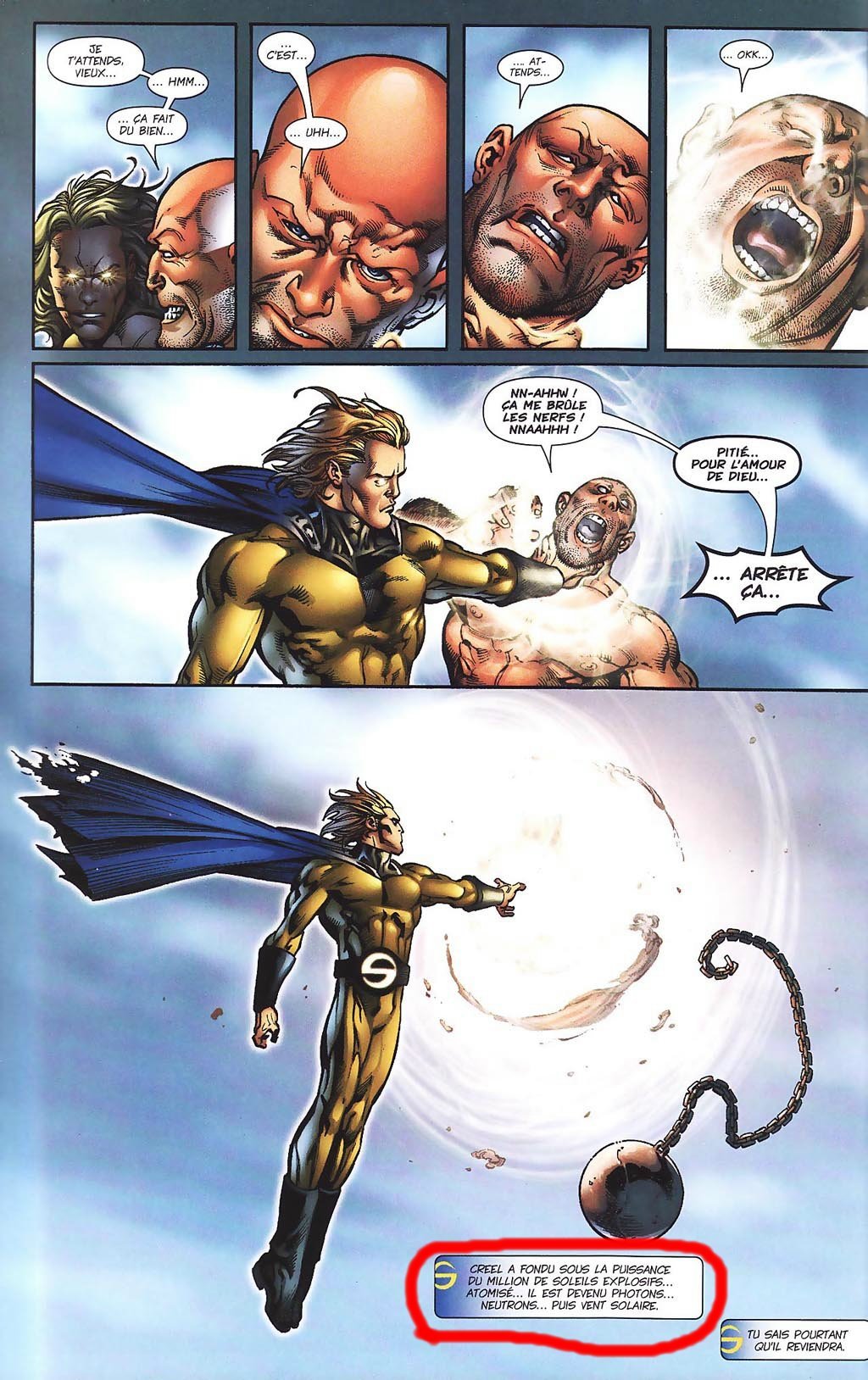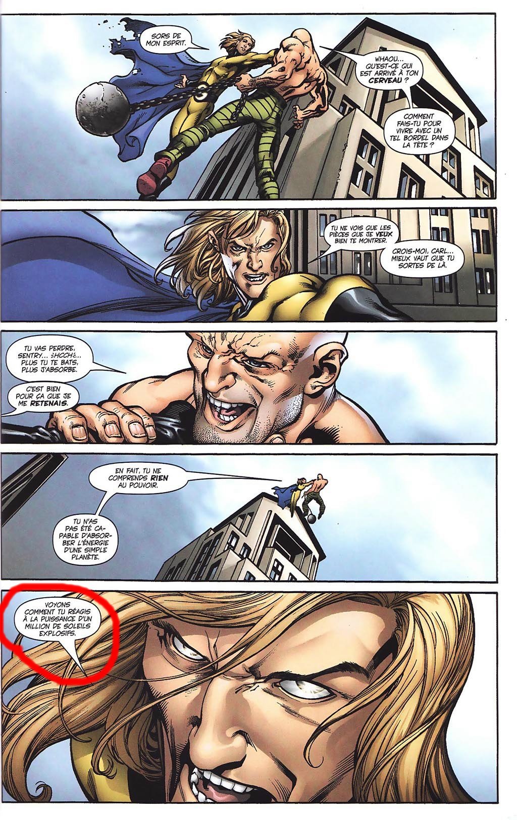 Sentry manipule l'énergie de 1 000 000 de supernova grace au pouvoir psionniques et ces attaques sont ciblès sur hulk UNIQUEMENT,1 supernova raye le systeme solaire tout entier,alors l'énergie produite pas un million...Autre feat de sentry http://www.comicvine.com/sentry/4005-1454/forums/respect-sentry-654344/