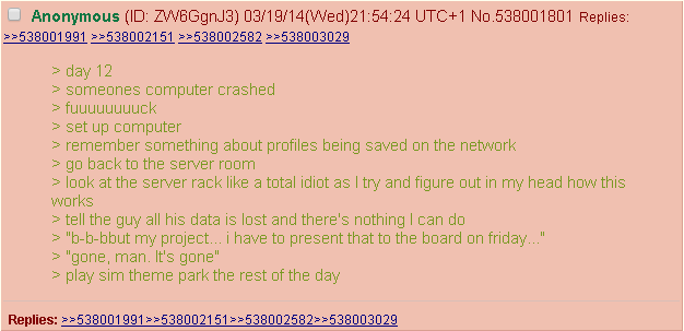 Je suis pas dans ton cas mais si tu t'ennuies je te conseille de lire l'histoire d'un responsable informatique totalement incompétent et qui passe son temps à rien branler qu'un gars avait posté sur 4chan ya plusieurs années. C'est assez drôle.