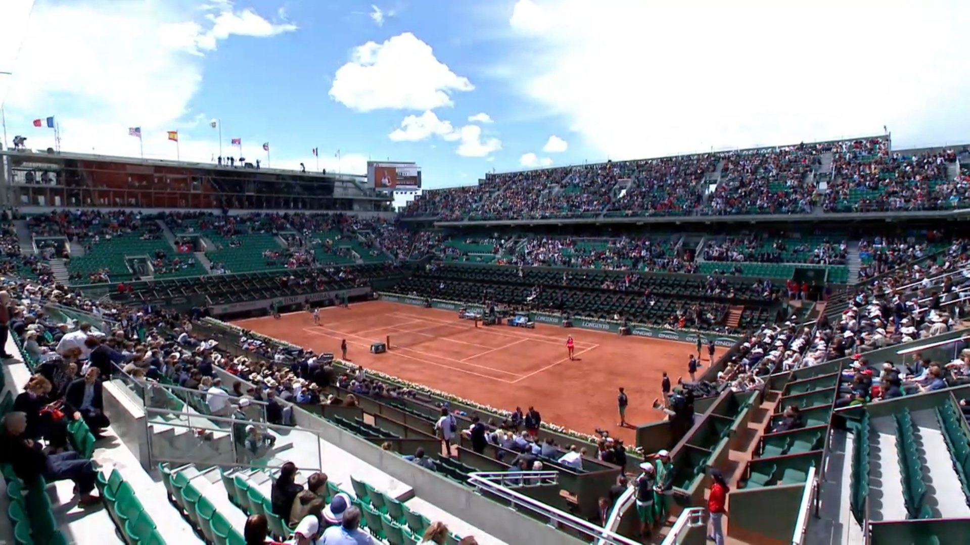 14h, quart de finale, une joueuse française. Les riches ont déserté. De toute façon ils ont pas payé leur place donc c'est pas grave s'ils viennent pas. Ils viendront faire un tour vers 17h peut-être, si ça bouchonne pas trop entre la porte d'Auteuil et la porte Dauphine