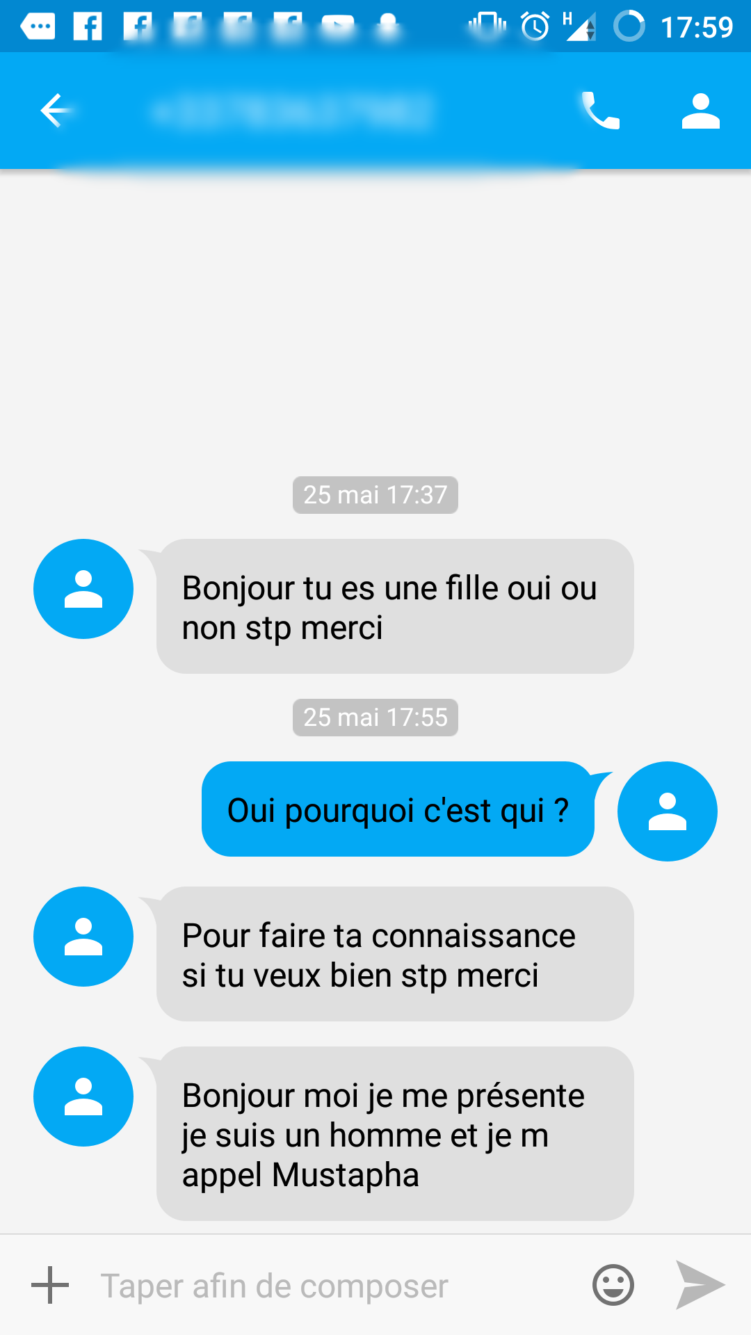 Le mec m'envoie :" Bonjour tu es une fille oui ou non stp merci"J'ai réussi à tracer son num, il appartient à un certain Mustapha S. (je donne pas son nom en entier mais je l'ai).