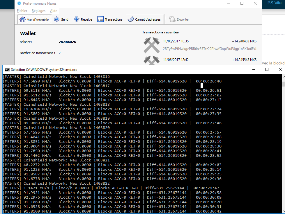 Ca y est j'ai reussi a miner en pool, j'ai abandonné le solo miner ca ne marche pas, plus qu'a attendre que les NEXUS tombent