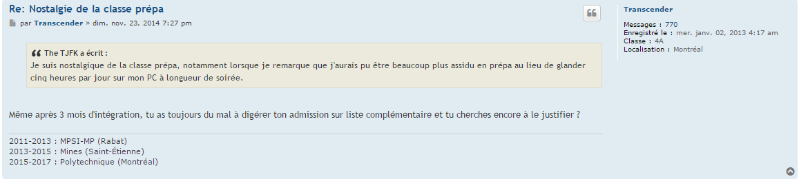En vrai avec un peu de recul c'est pas drôle, juste badant. Il était tourné en ridicule par beaucoup de monde, mais d'un autre côté il le cherchait vraiment beaucoup. Le pire c'est que c'est pas tant un génie que ça, il est très bon et vient d'un très très bon lycée parisien (Franklin) mais il y avait meilleur que lui parfois en composition et des gens très bien socialement...