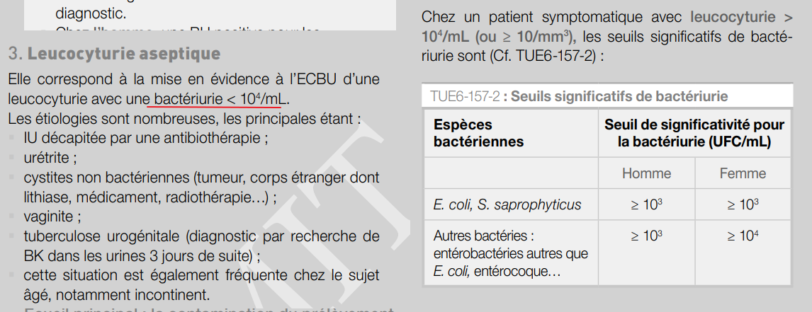 Justement, tu peux avoir une bactériurie significative > =10^3...... mais le pilly dit également leucocyturie aseptique < 10^4.