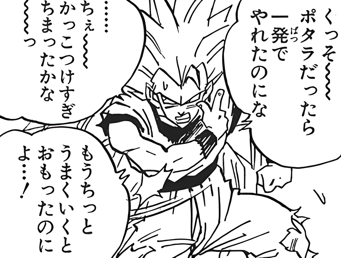 « Merde... Avec les Potalas, j'aurais pu le faire d'un seul coup... Tss... J'ai trop essayé de paraître cool... Je pensais que ça irait un peu mieux...! »Il n'était pas conscient de son erreur au début du combat, car il n'avait aucune idée de l'étendue de la puissance de Kid Buu :