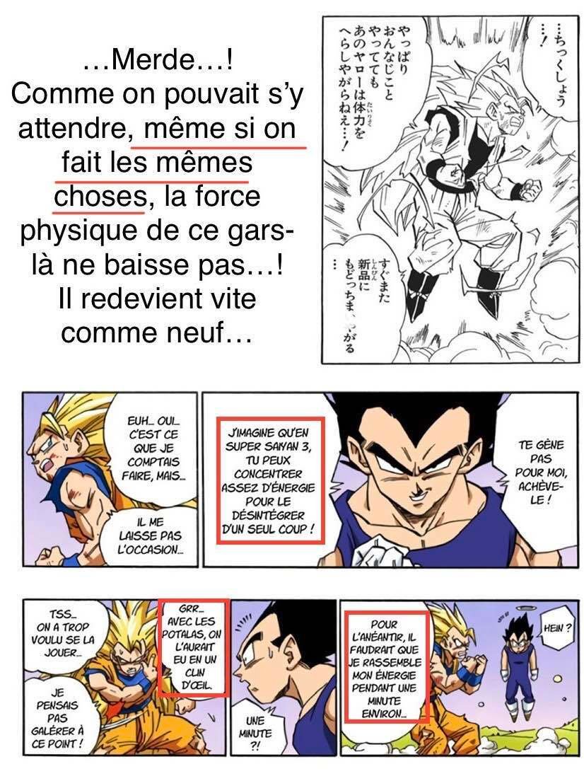 Osef de ce faux débat et ttes ses explications abracadabrantes.Tout ce que je vois c'est Goku ssj3 qui gère Kid Buu en 1v1 à égalité et qui doit s'incliner uniquement par la regen de Buu et la stamina réduite du ssj3 qui se consomme en deux deux dans l'univers des mortels , si le combat s'était déroulé au paradis Goku l'aurai finish him.