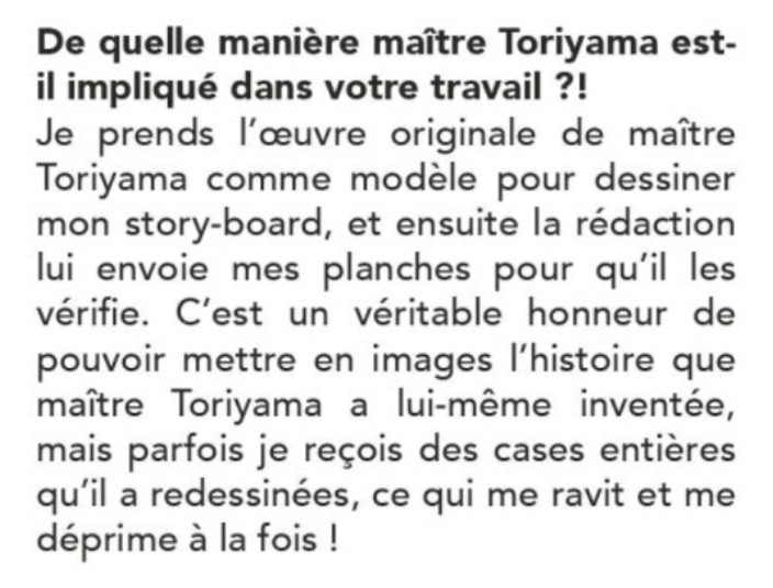 Toyotaro : « C'est un véritable honneur de pouvoir mettre en images l'histoire que maître Toriyama a inventée »Je te vois venir avec les storyboards, parce que tu adores mélanger les choses, mais c'est exactement comme les storyboards des superviseurs d'épisodes de l'animé, qui se calquaient sur l'intrigue du manga. L'histoire ne change pas, mais la mise en scène est retravaillée.
