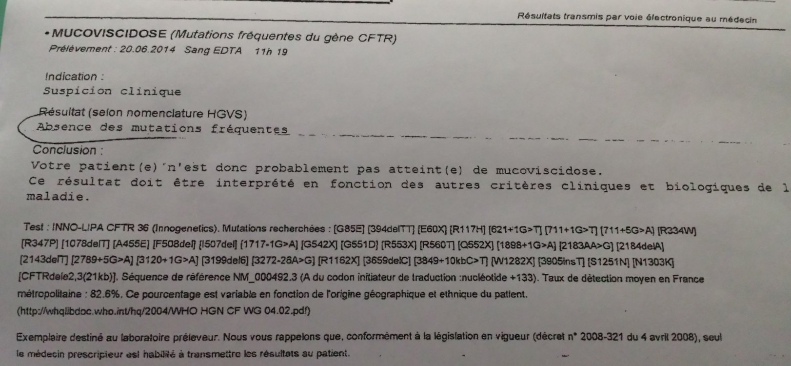 Je dois recevoir aujourd'hui le kit d'analyse, je vous prendrai des photos avec à côté mon analyse de la mucoviscidose si vous voulez et un compte rendu.
