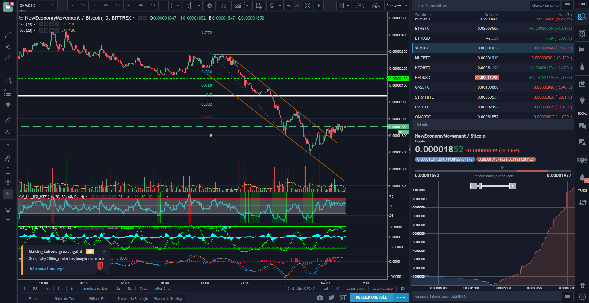Sympa ce petit canal, mais je suis un peu sceptique quant à l'utilisation des indicateurs personnellement, surtout pour les cryptomonnaies qui ne semblent pas se baser sur une analyse graphique mais plus un sentiment de marché. J'ai un peu tradé le Forex et les indicateurs servaient assez peu, juste moyennes mobiles, sinon je m'appuyais surtout l'analyse fondamentale et le repérage des résistances/supports en différentes périodes pour déterminer une tendance haussière ou baissière générale avec H1/J1 puis en intraday avec M5 Finalement malgré toute ma technique j'ai rarement gagné