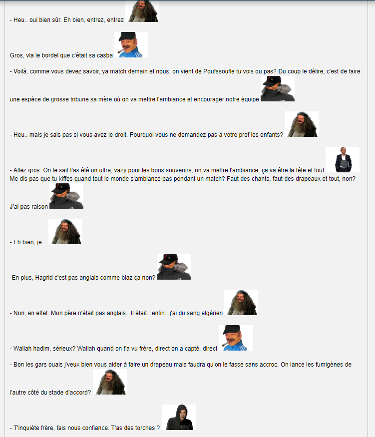 MAIS, je vois très bien que plus la fic avance, plus les personnages manquent de profondeur et j'ai peur qu'au final, ce soit un enchaînement de "gags" dans lesquels tu pourrais intervertir Ahmid par Youssef ou Souleyman par Ahmid, tu vois?